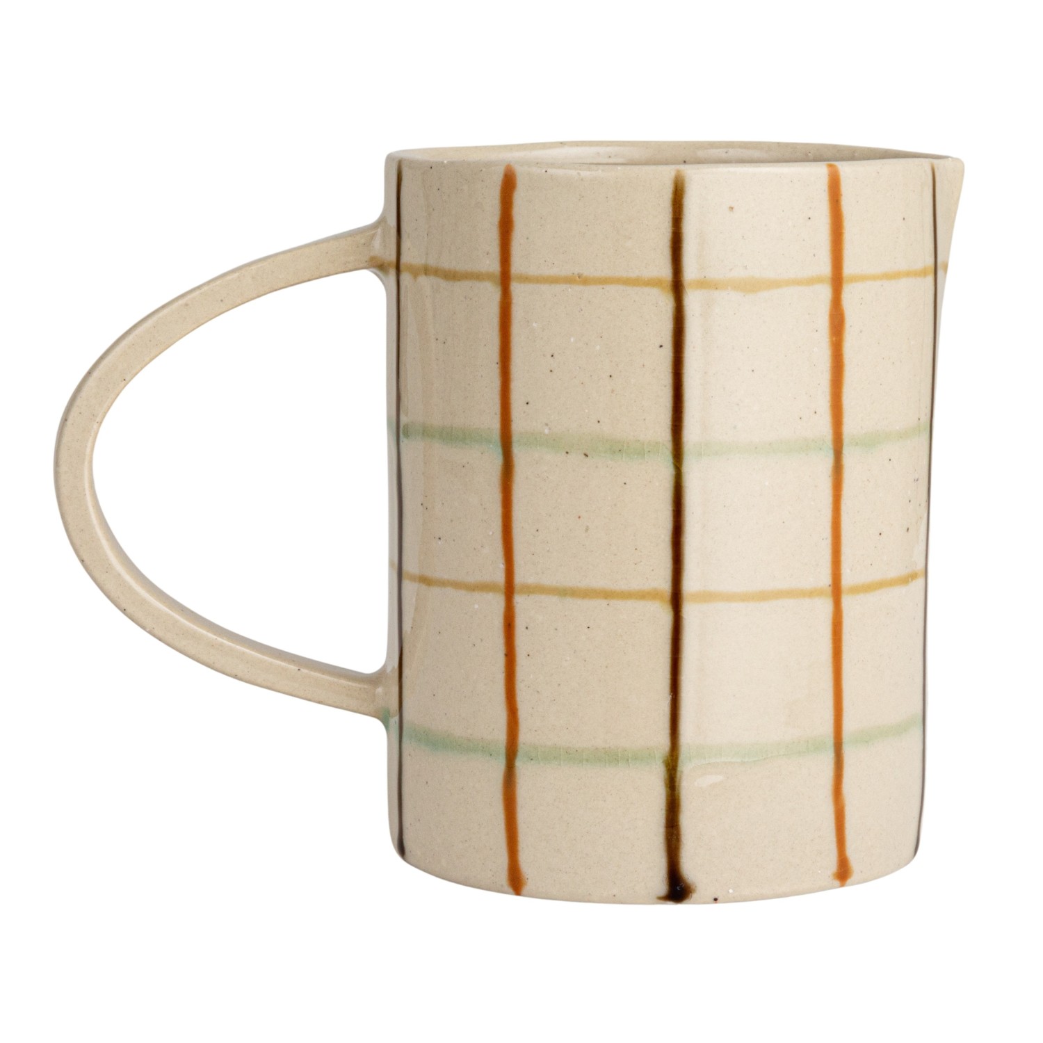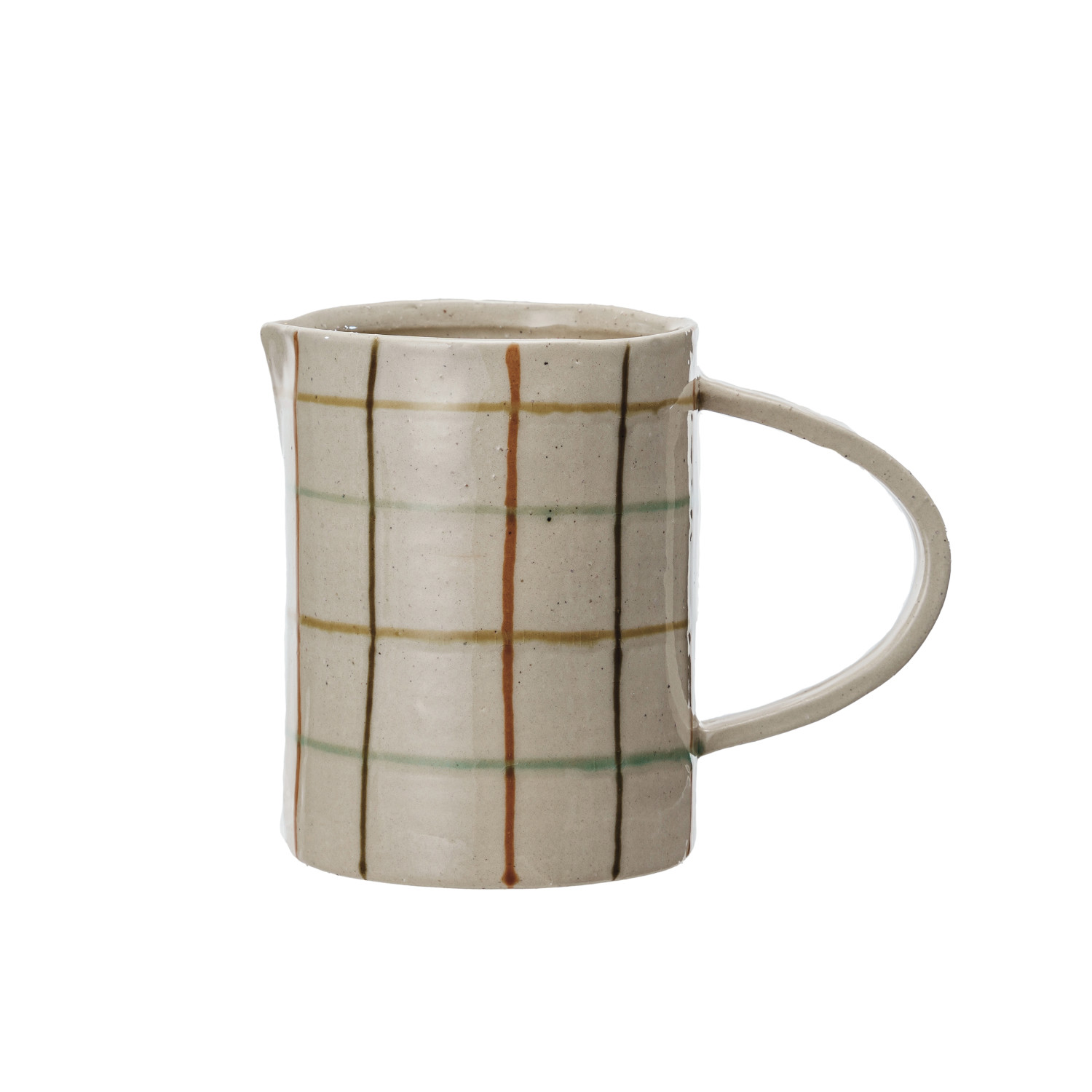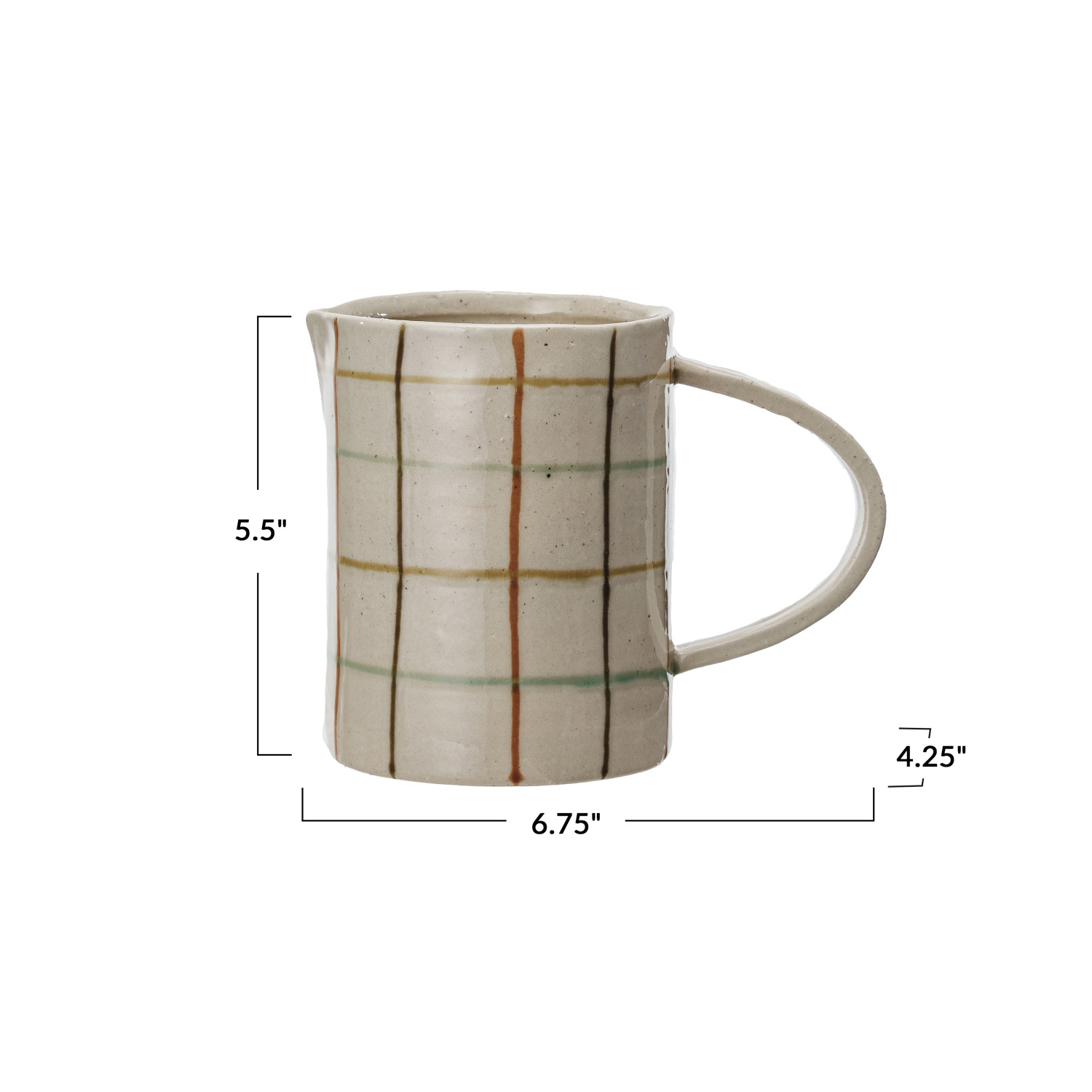 This 32 oz. Stoneware Pitcher is a true embodiment of eclectic design, featuring a charming round shape with multicolored thin checkered lines encircling its entire surface. It measures 6.75 inches in length by 5.5 inches in height. The side handle provides a comfortable grip, making it easy to pour drinks during gatherings or quiet dinners. Its versatile style makes it suitable for a variety of decor themes, from boho to Scandinavian to cottagecore, as well as French country and farmhouse aesthetics. Whether used for serving refreshments or as a decorative vase, this pitcher adds a splash of color and personality to any setting.