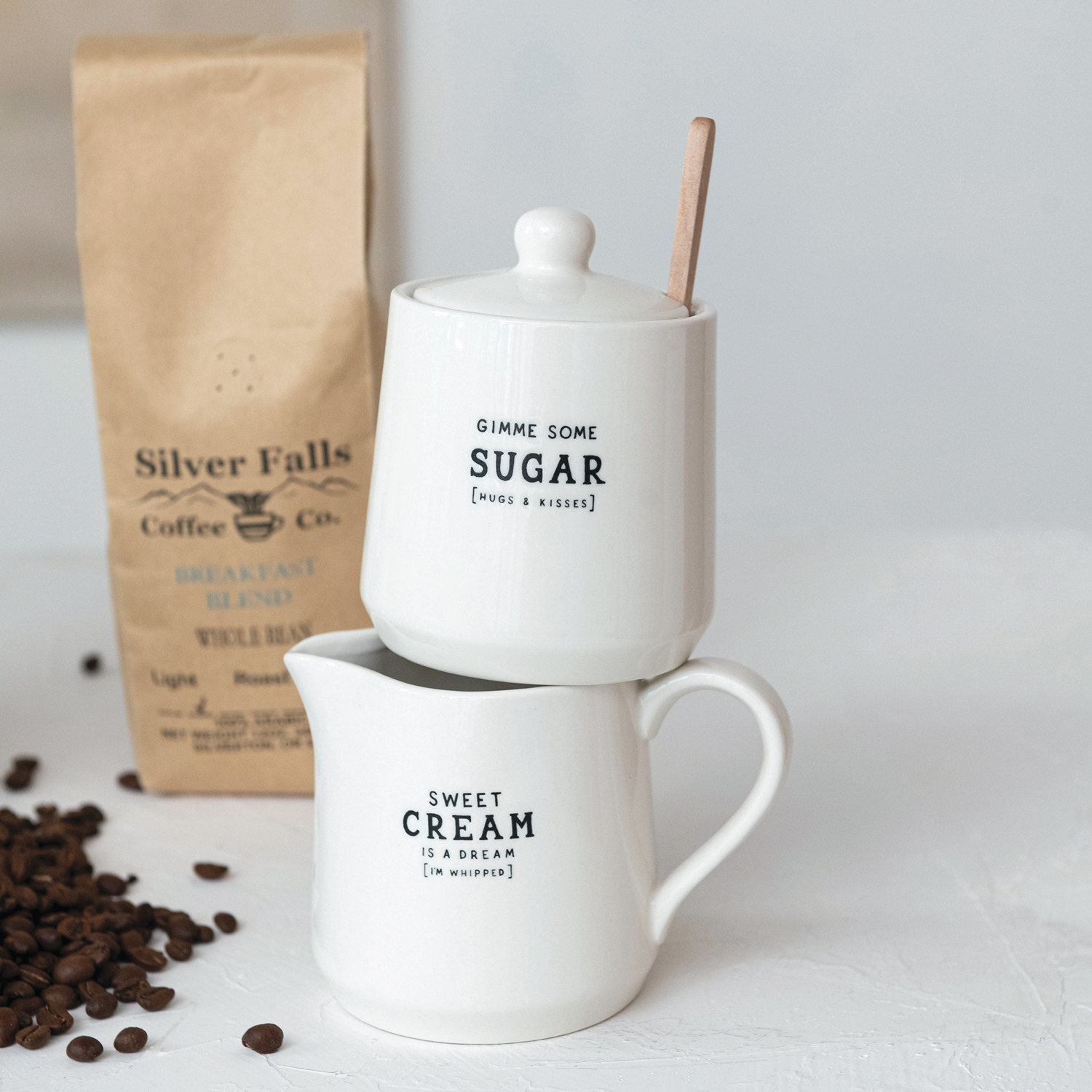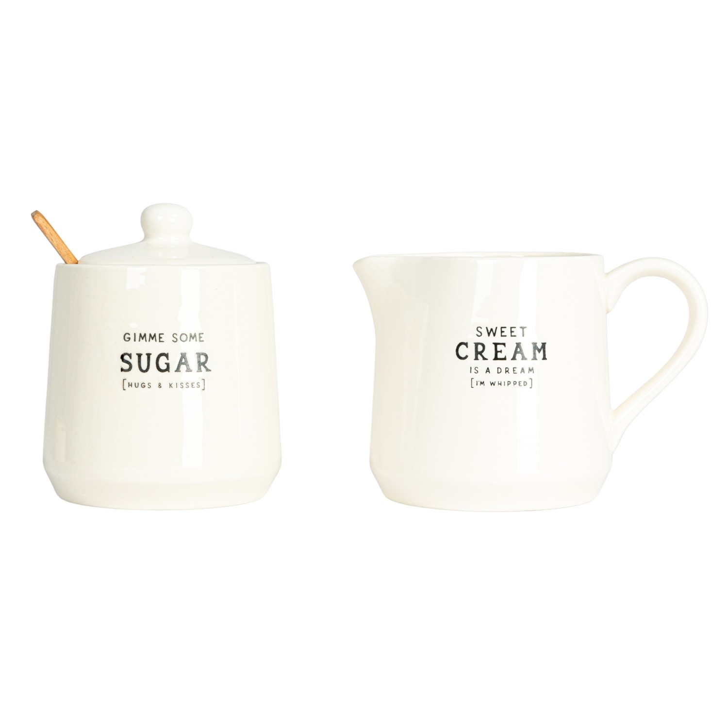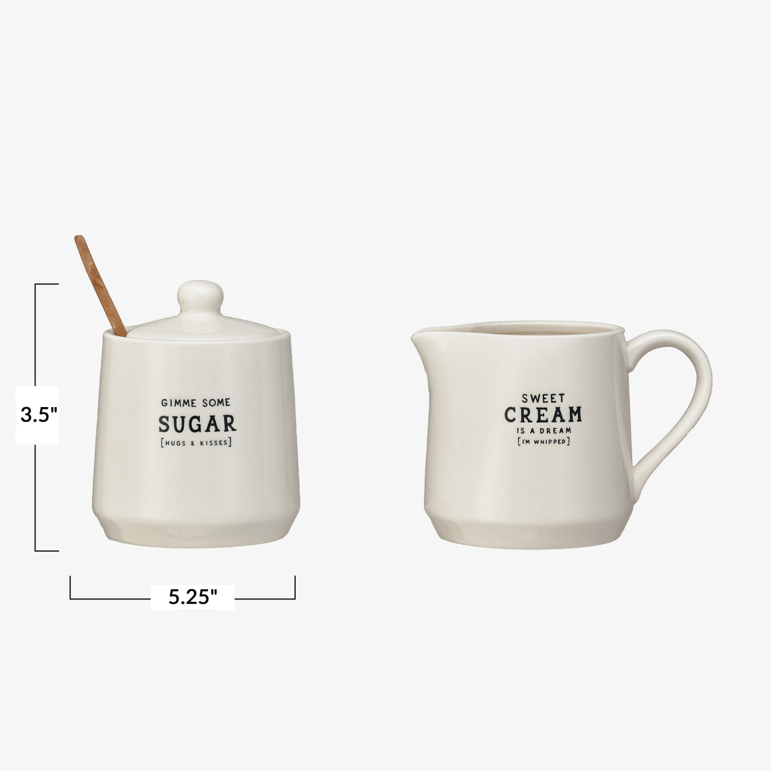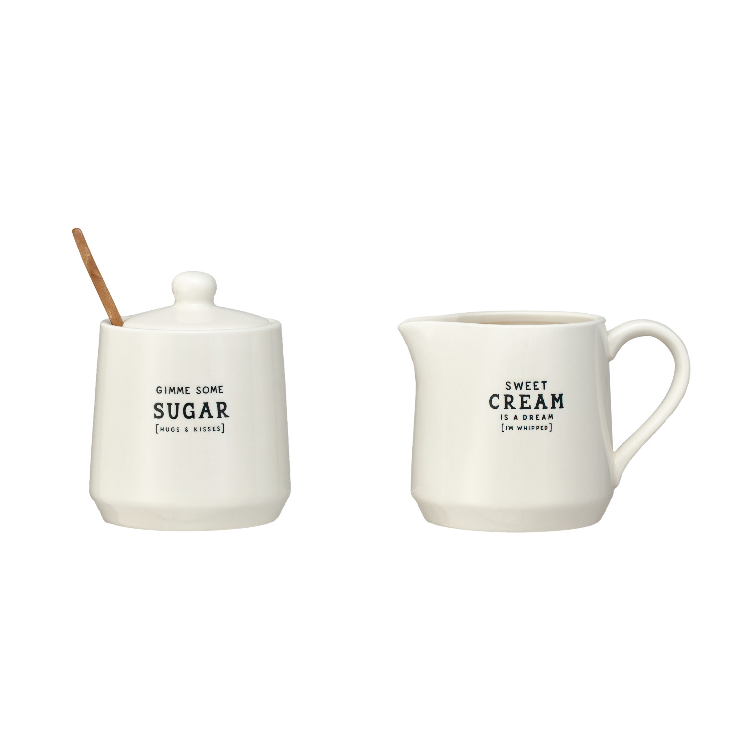 Catalog Name: 5-1/4"L x 3-3/4"W x 3-1/2"H 12 oz. Stoneware Creamer & 3-1/2" Round x 4-1/4"H 12 oz. Sugar Pot w/ Wax Relief Saying & Bamboo Spoon, White & Black, Set of 3 ©