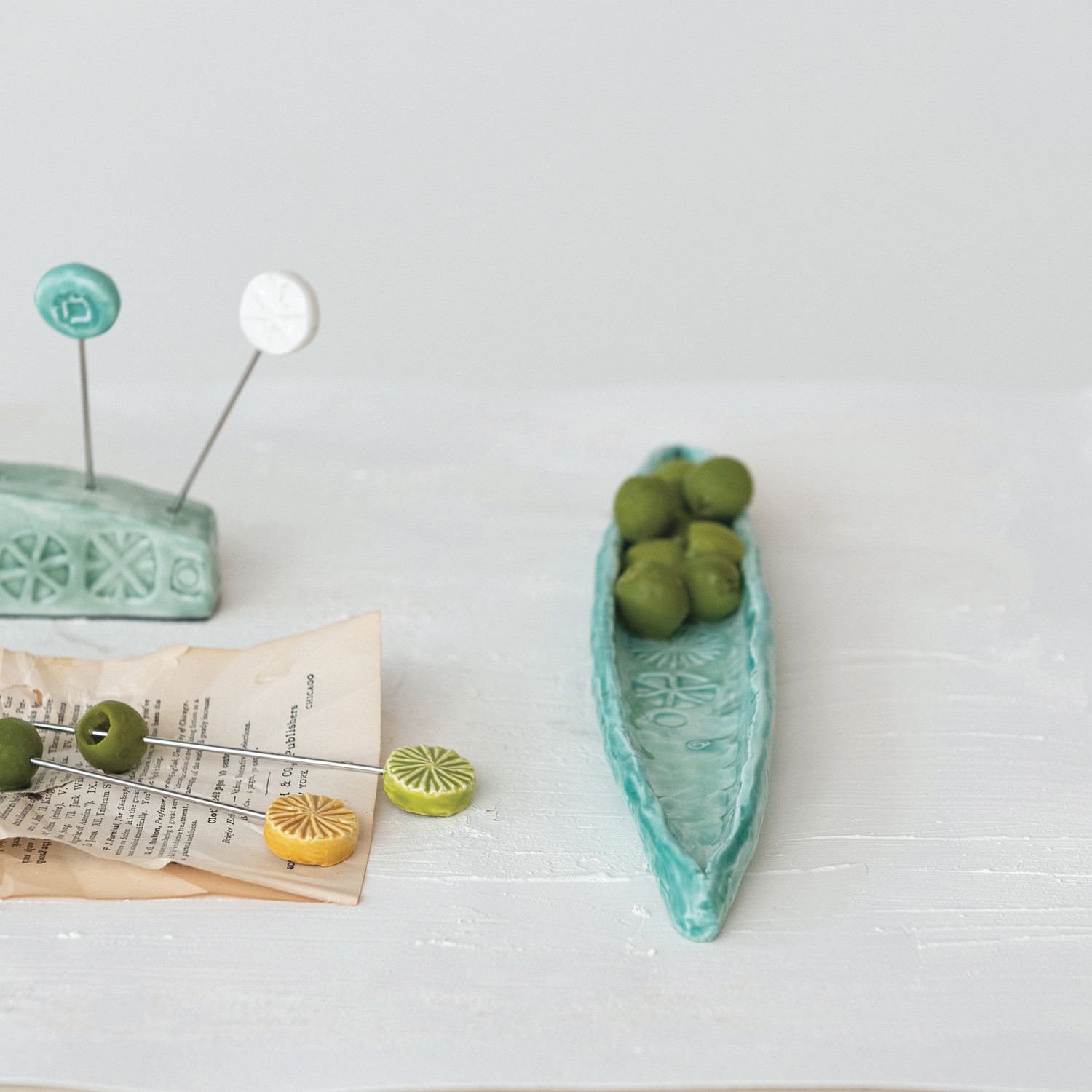 Hand-Painted Debossed Stoneware Olive Dish, Aqua ©