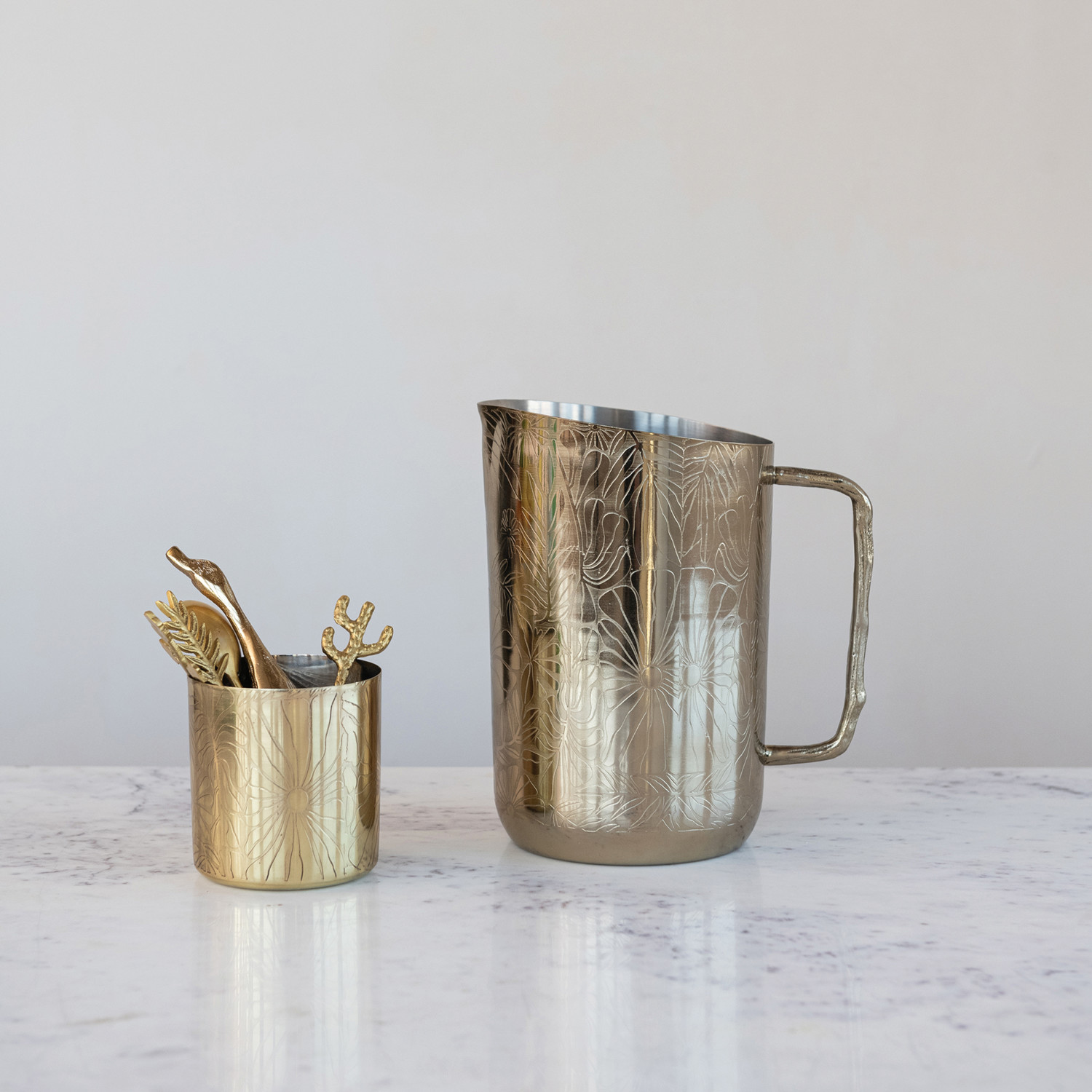 Catalog Name: 7-1/2"L x 5"W x 8-1/4"H 2 Quart Stainless Steel Pitcher w/ Etched Flowers & Brass Twig Shaped Handle