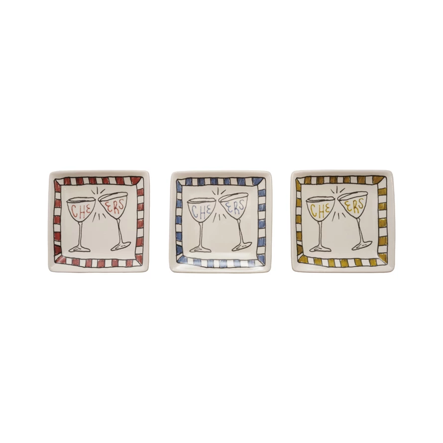 Catalog Name: 5" Square Stoneware Dish "Cheers”, 3 Colors