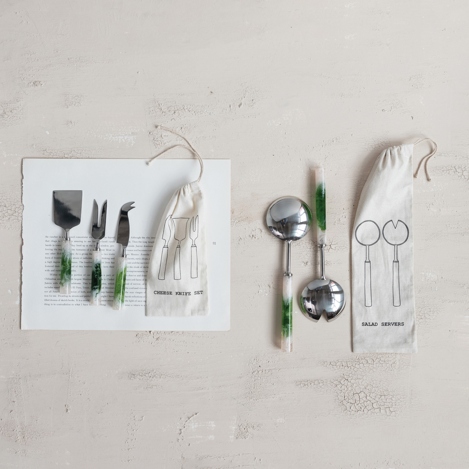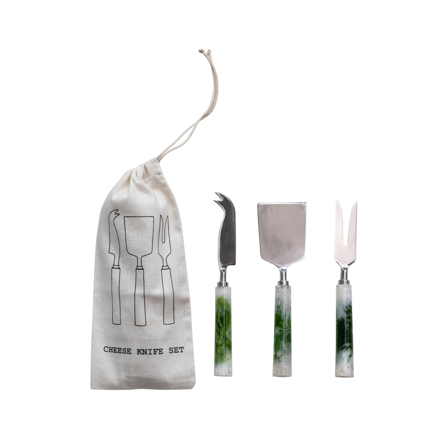 Catalog Name: 6-3/4"L - 7-1/4"L Stainless Steel Cheese Utensils w/ Marbled Resin Handles, Green & White, Set of 3 in Printed Drawstring Bag (Each One Will Vary)
