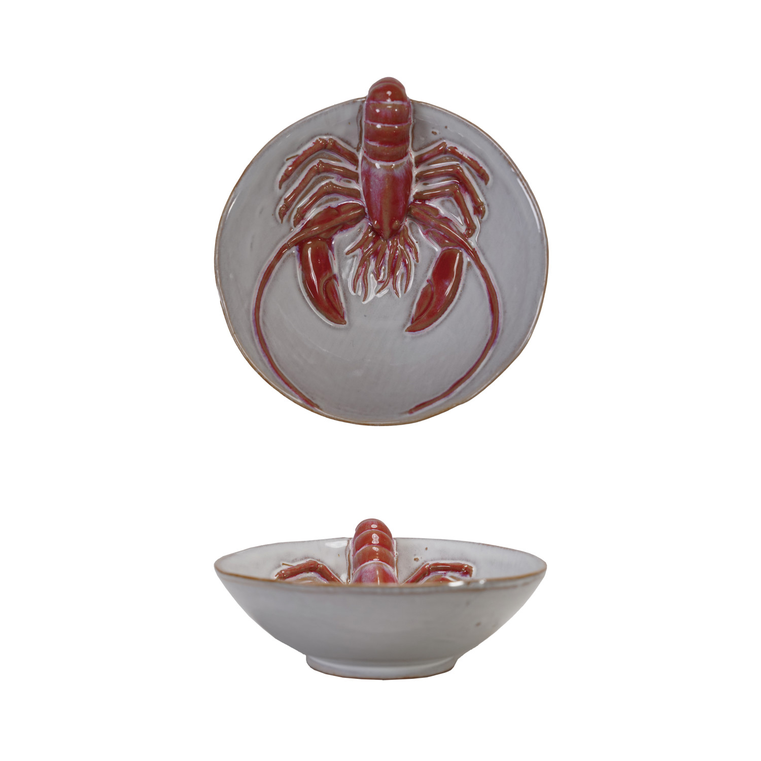 Catalog Name: 5-3/4"L x 5-1/4"W x 2"H Stoneware Bowl w/ 3D Lobster, Reactive Glaze, White & Red (Each One Will Vary)