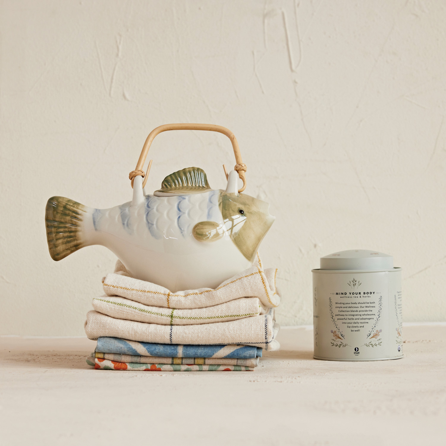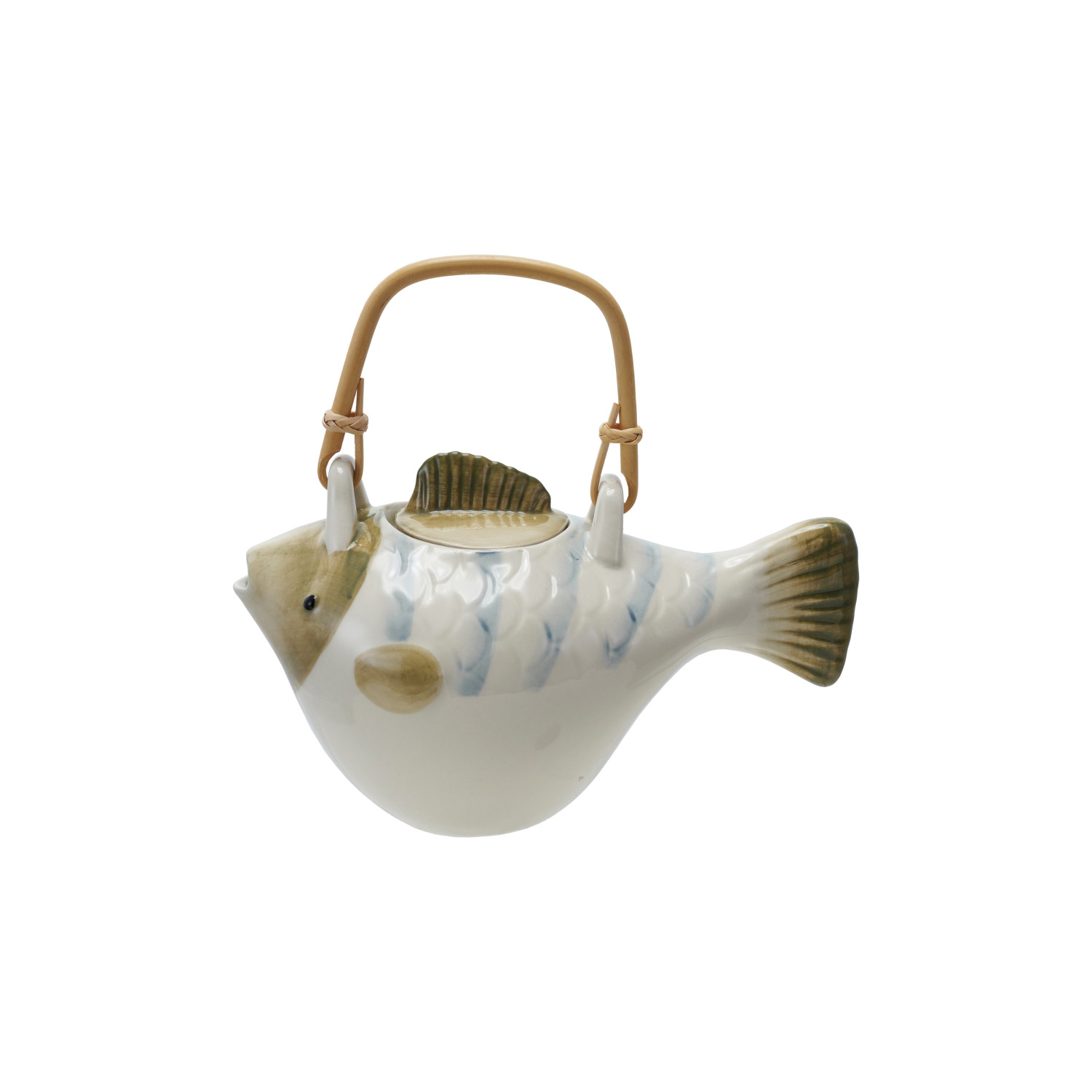 Catalog Name: 9-1/4"L x 5-1/4"W x 5-1/4"H 24 oz. Hand-Painted Stoneware Fish Shaped Teapot w/ Metal Strainer & Bamboo Wrapped Handle, Multi Color, Set of 2