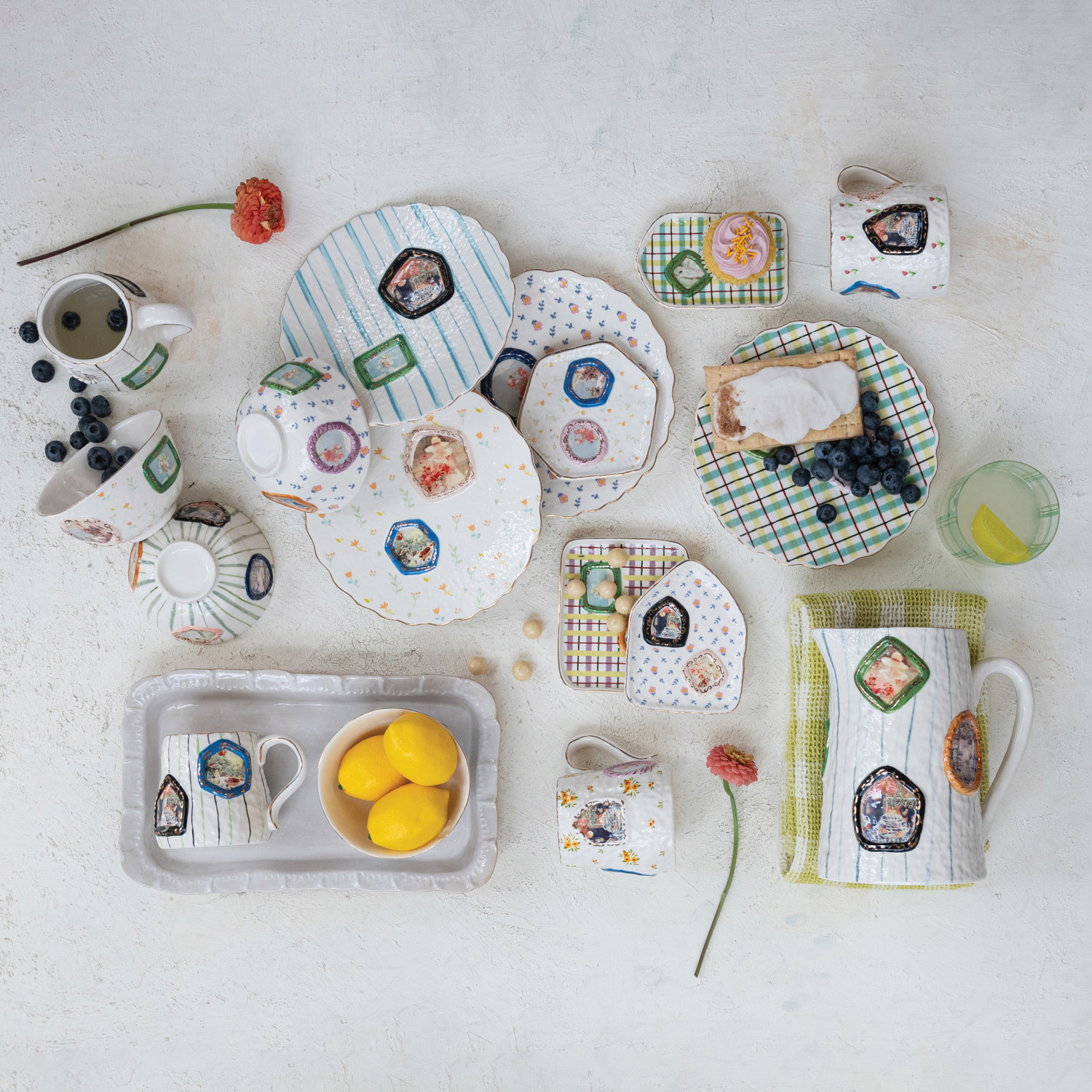 Catalog Name: 7-1/4"L x 5"W x 7-3/4"H 60 oz. Hand-Painted Embossed Stoneware Pitcher w/ Pattern, Picture Frames & Gold Electroplating, Multi Color