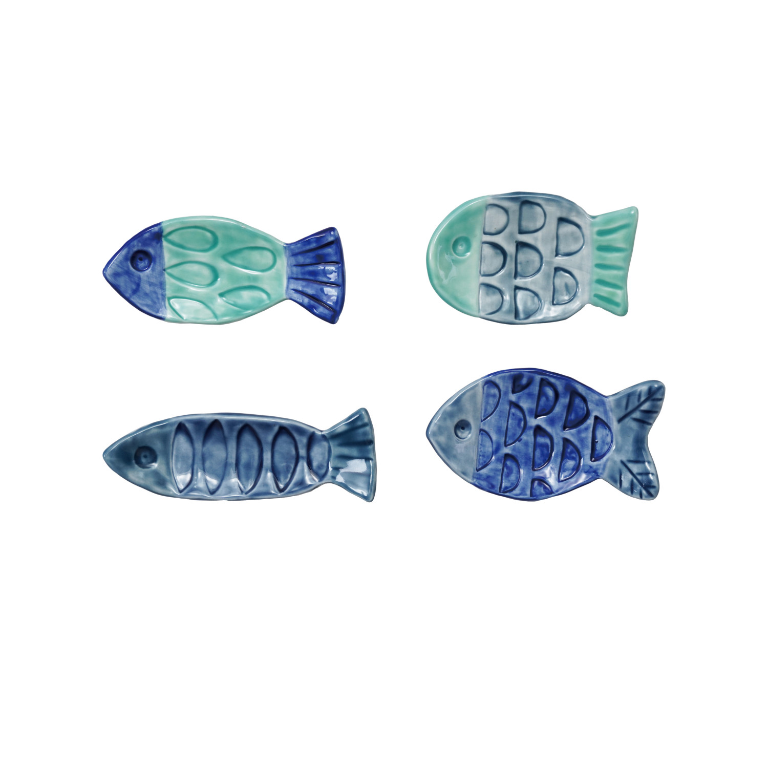 Catalog Name: Approximately 4"L Hand-Painted Stoneware Fish Shaped Dish, Multi Color Blue, 4 Styles ©
