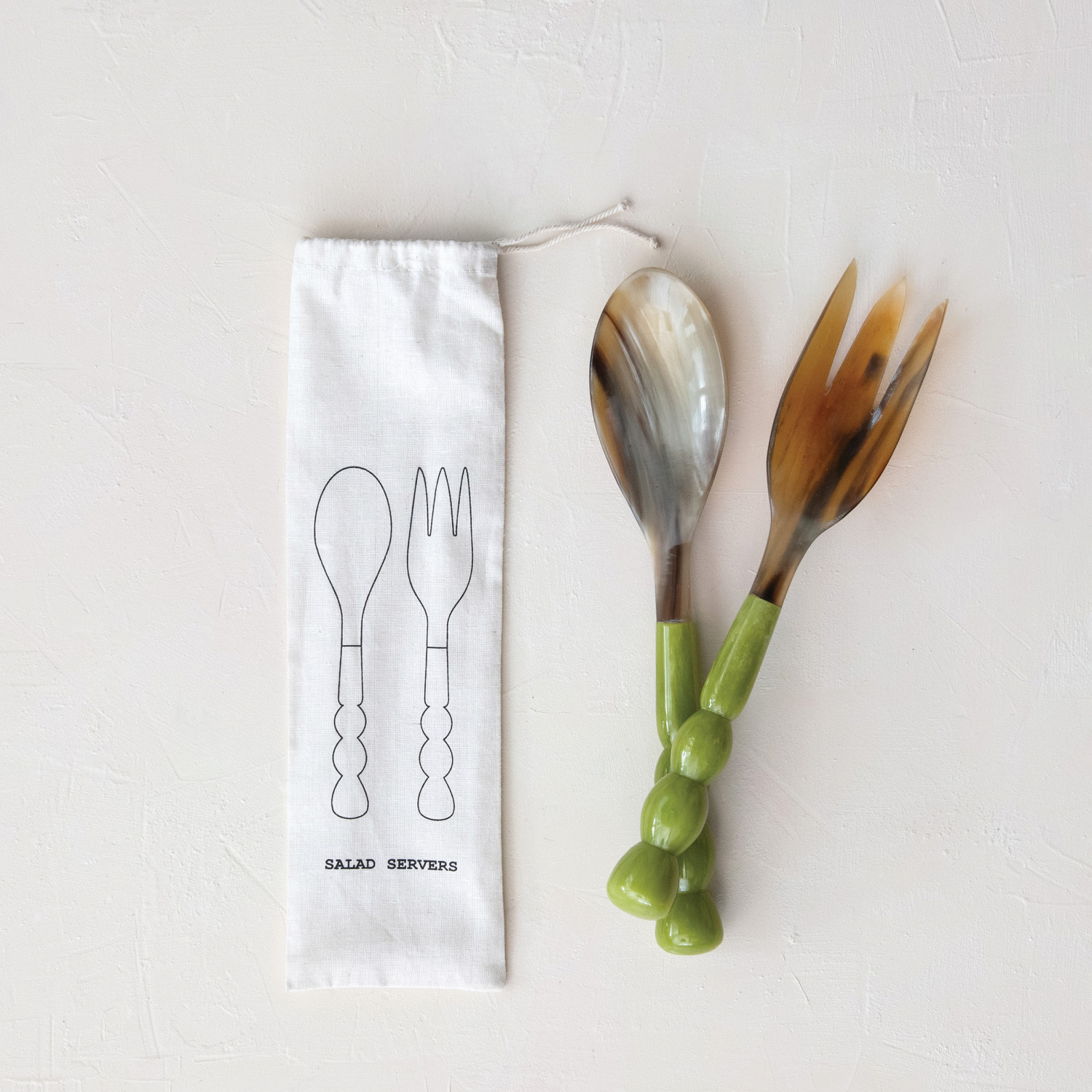 Catalog Name: 12"L Natural Horn Salad Servers w/ Marbled Resin Handles, Green, Set of 2 in Printed Drawstring Bag (Each One Will Vary)