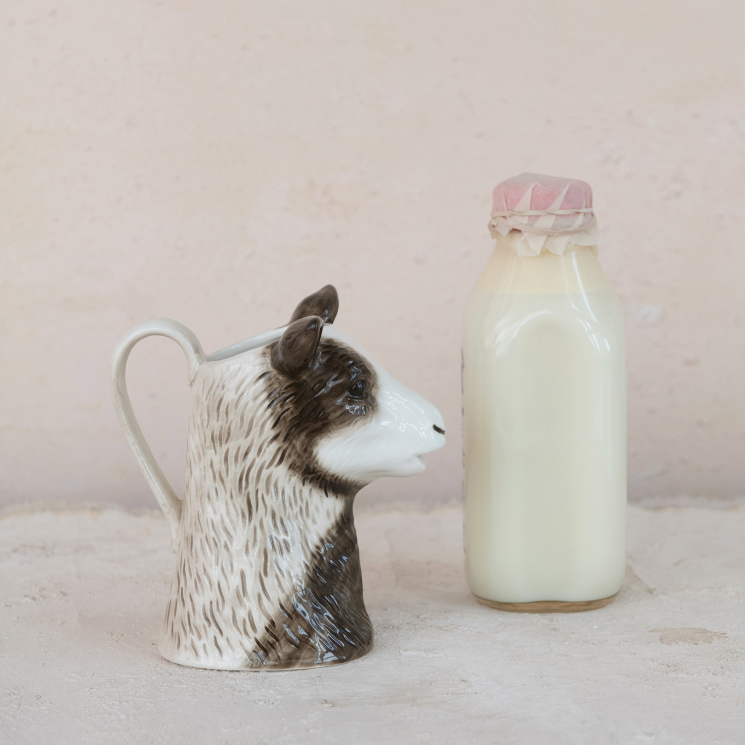 Catalog Name: 7"L x 5"W x 7"H 12 oz. Stoneware Goat Shaped Pitcher, Brown & White