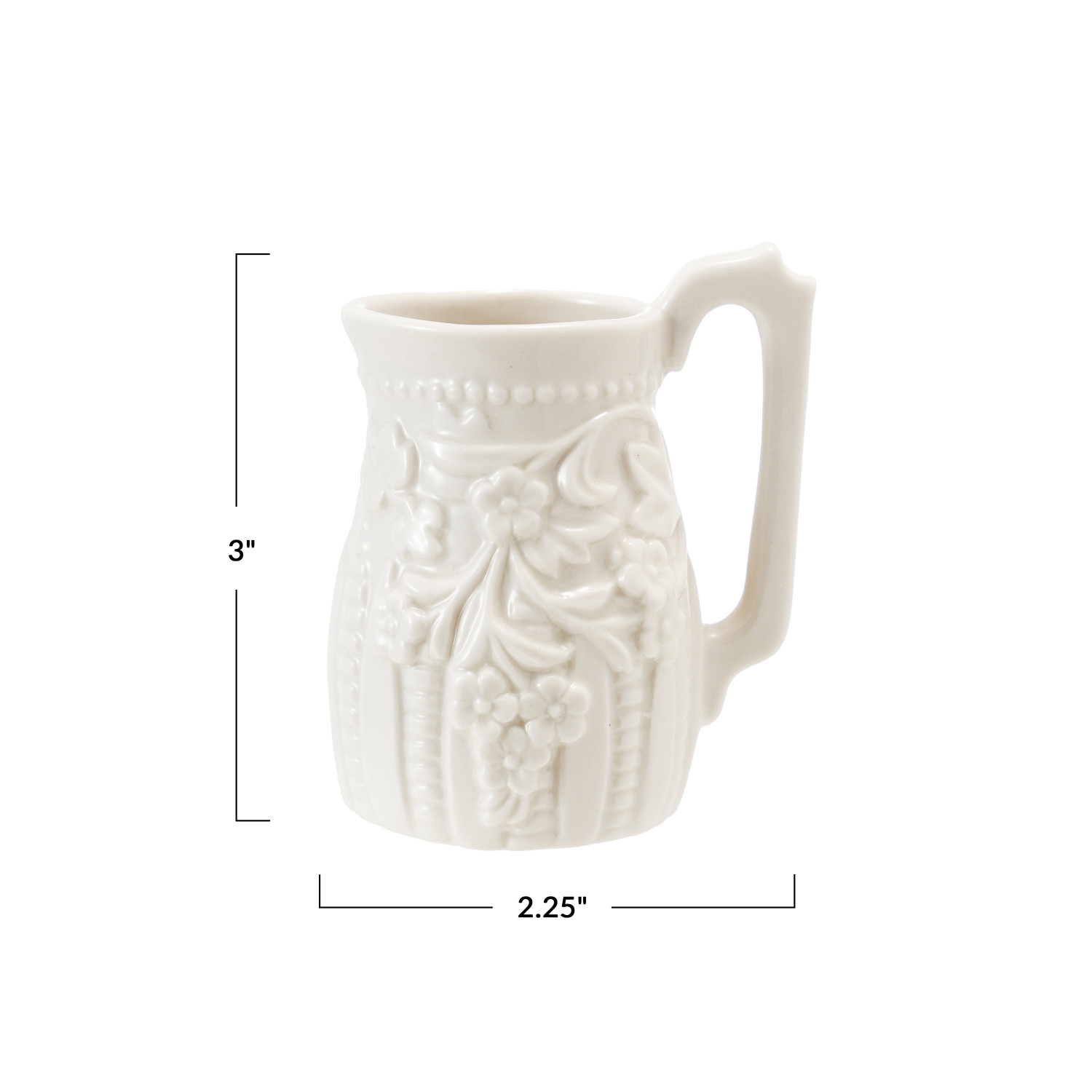 Catalog Name: 2-1/4"L x 1-3/4"W x 3"H 2 oz. Embossed Stoneware Vintage Reproduction Creamer, White