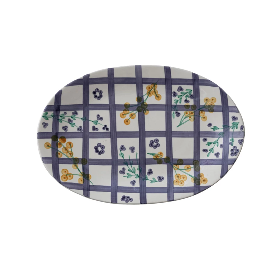 Catalog Name: 17"L x 11-1/4"W Hand-Painted Stoneware Platter w/ Grid Pattern & Botanicals, Multi Color (Each One Will Vary)