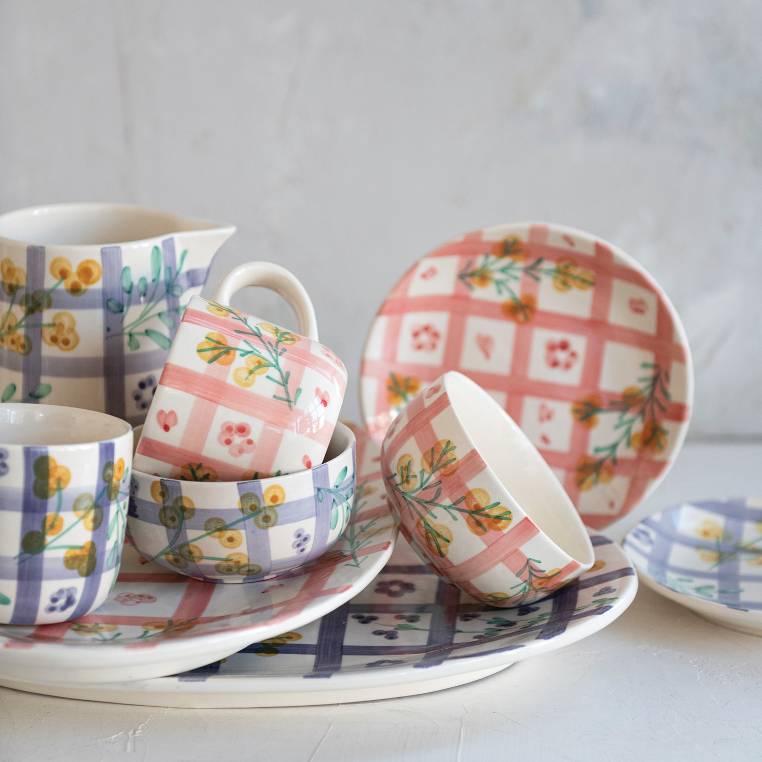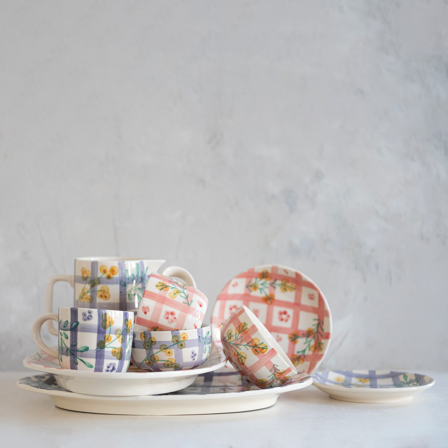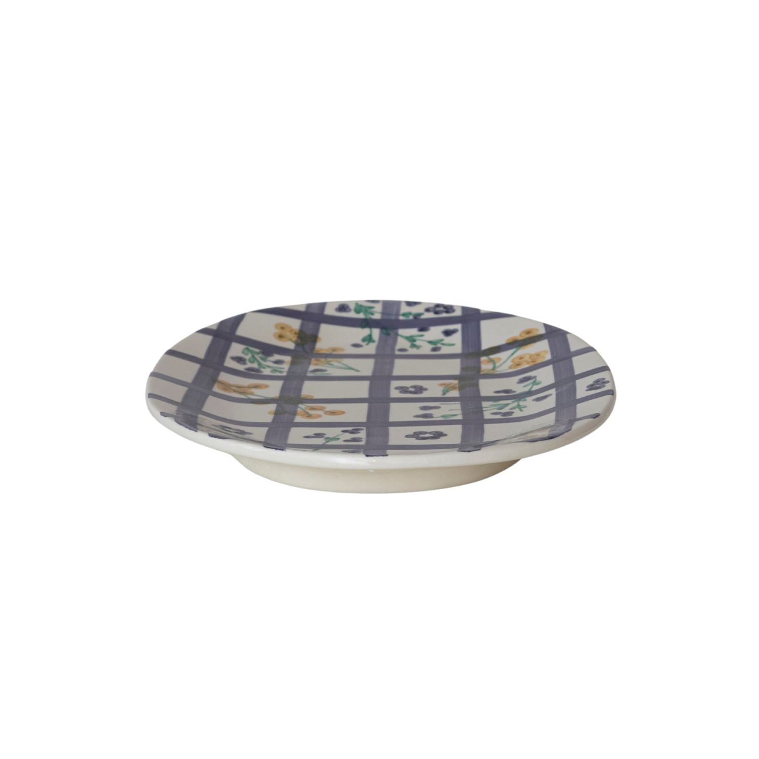 Hand-Painted Stoneware Platter with Grid Pattern & Botanicals (Each One Will Vary)