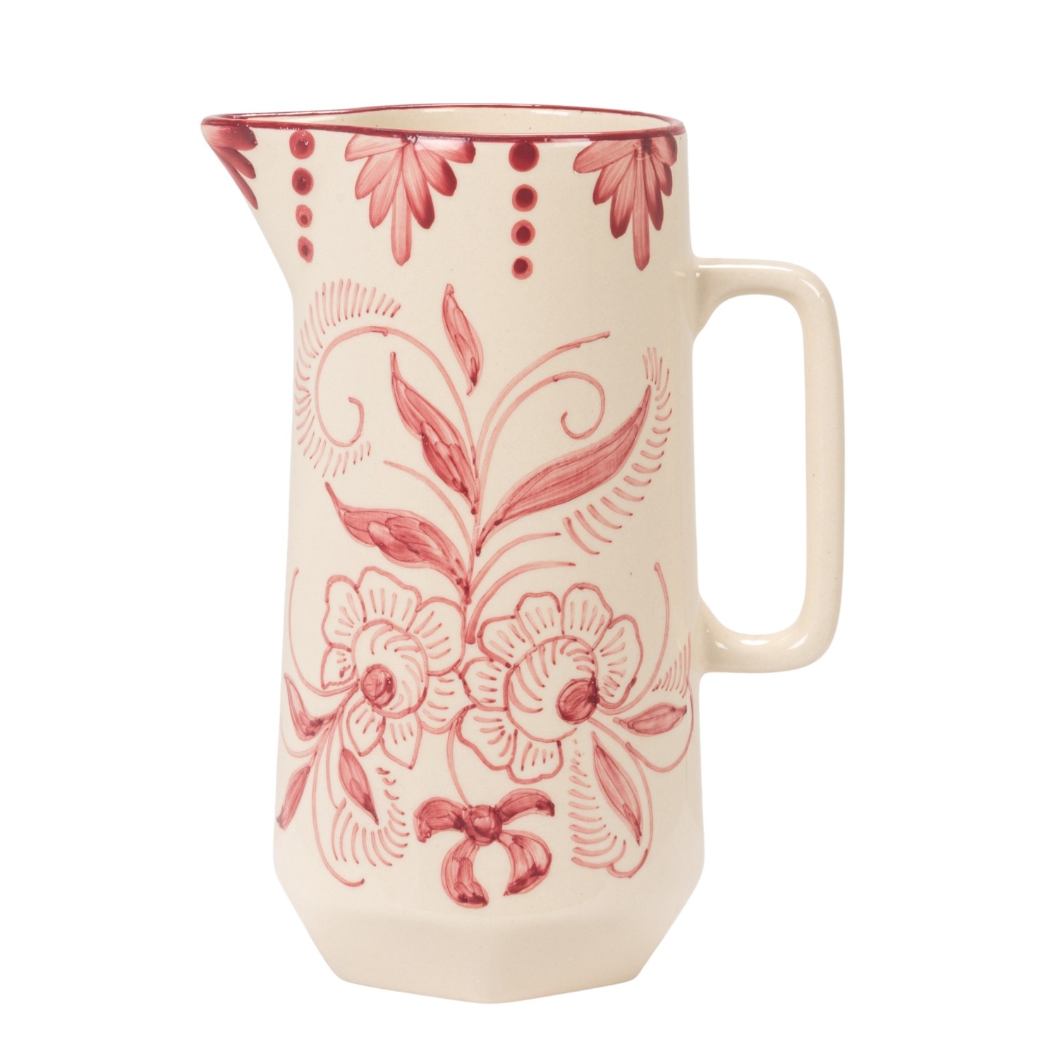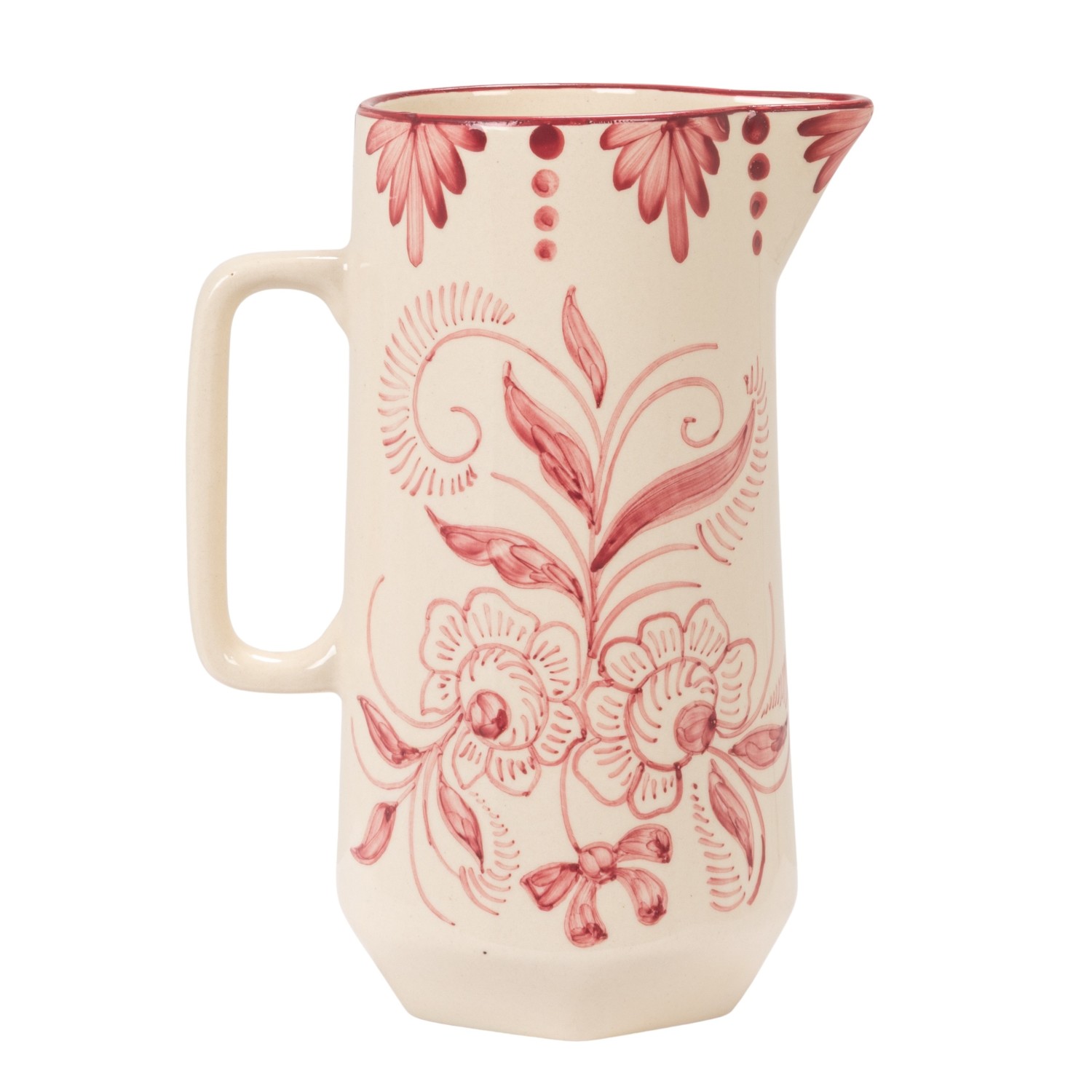 Catalog Name: 7-1/2"L x 5"W x 9-3/4"H 60 oz. Hand-Painted Stoneware Pitcher w/ Botanical Design, Burgundy & White (Each One Will Vary)