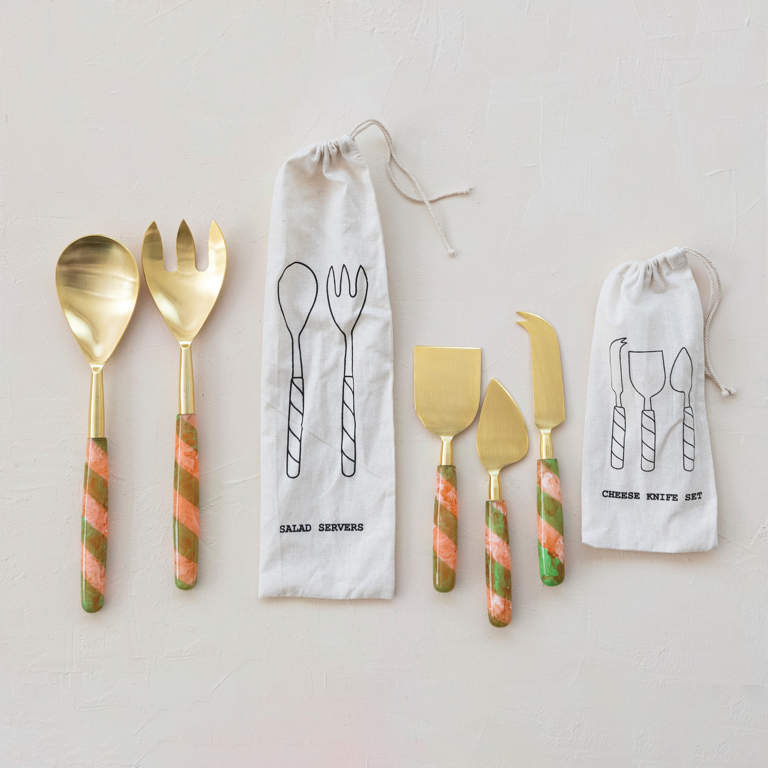 Catalog Name: 11"L Stainless Steel Salad Servers w/ Marbled Resin Striped Handles, Gold Finish & Multi Color, Set of 2 in Printed Drawstring Bag (Each One Will Vary)