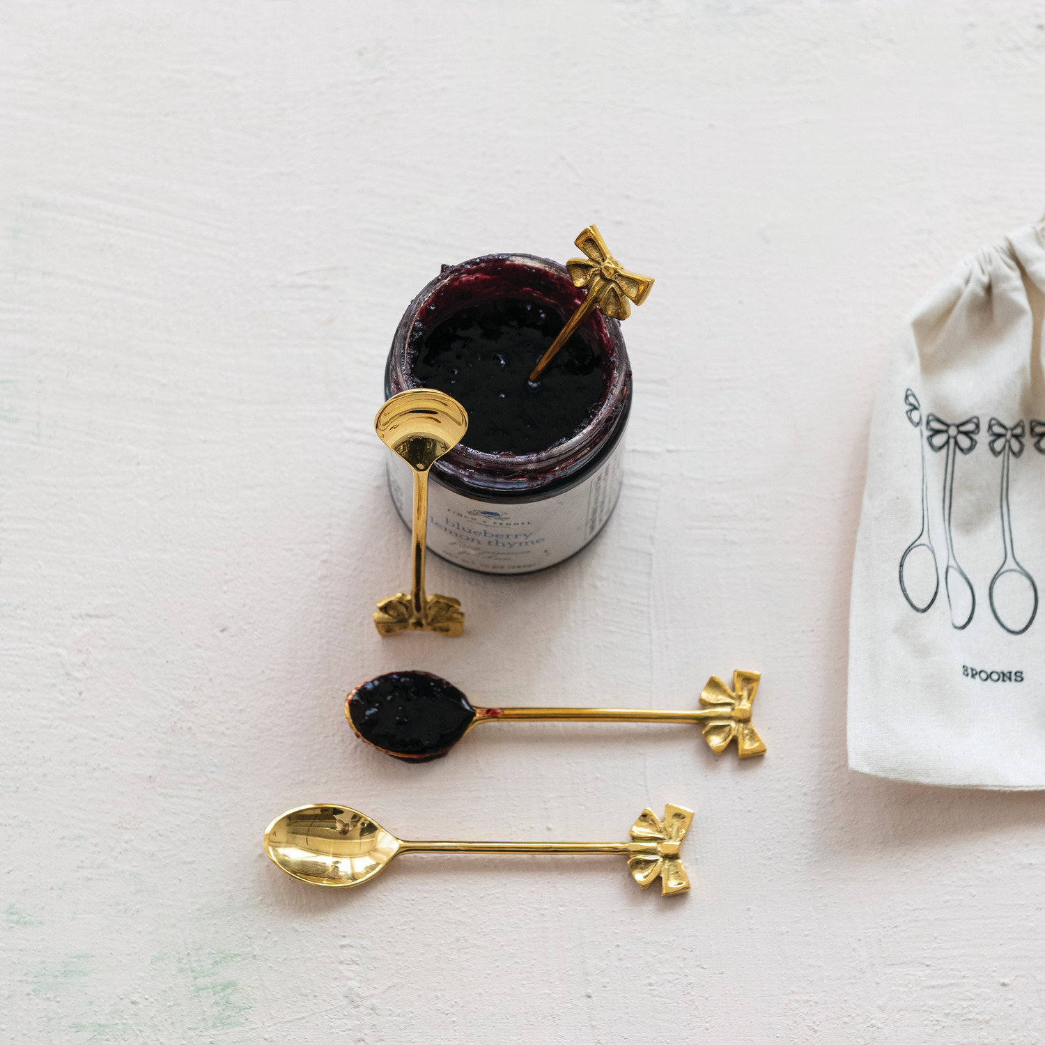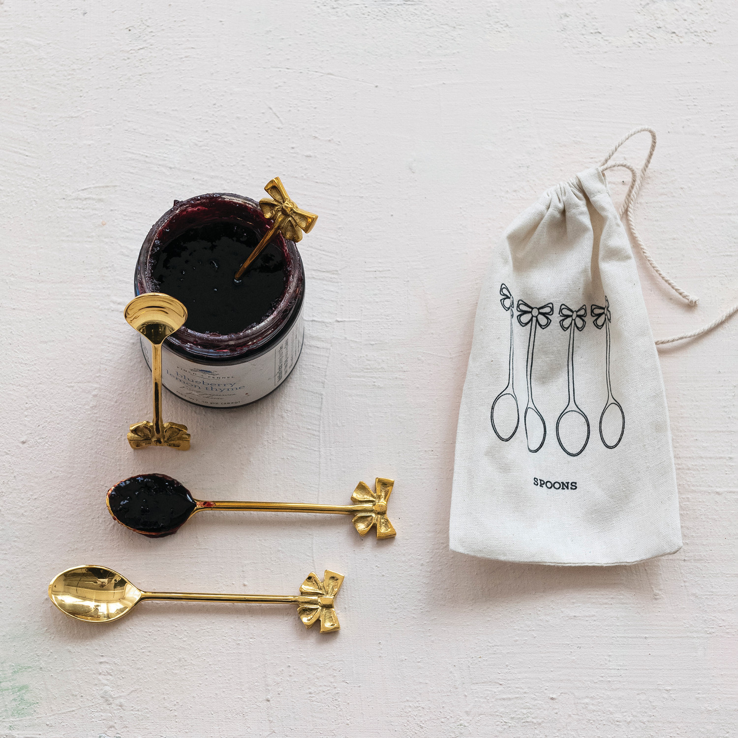 Catalog Name: 5"L Brass Spoons w/ Bow Shaped Handles, Set of 4 in Printed Drawstring Bag