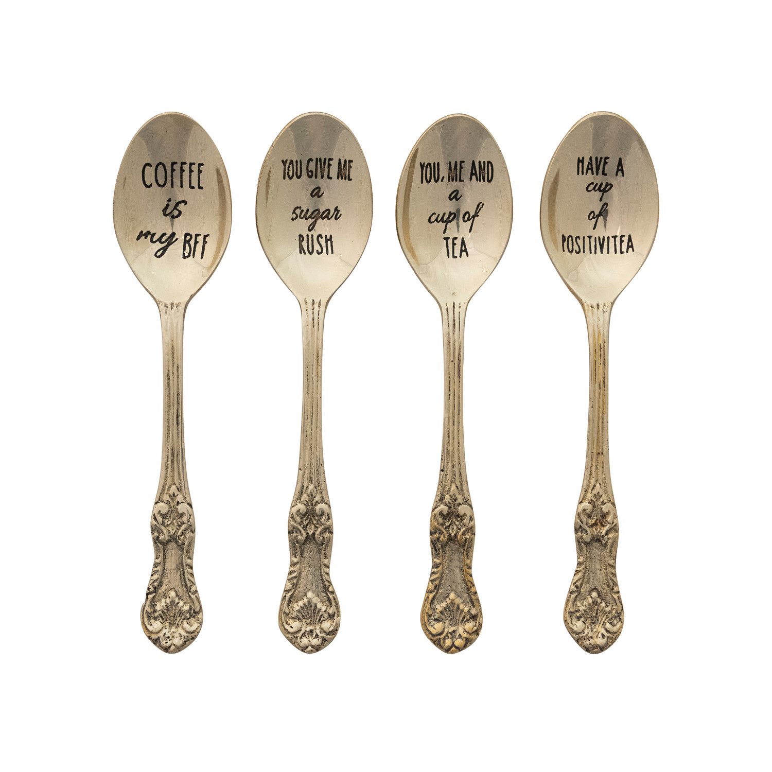Catalog Name: 6"L Embossed Brass Spoon w/ Etched Saying, 4 Styles
