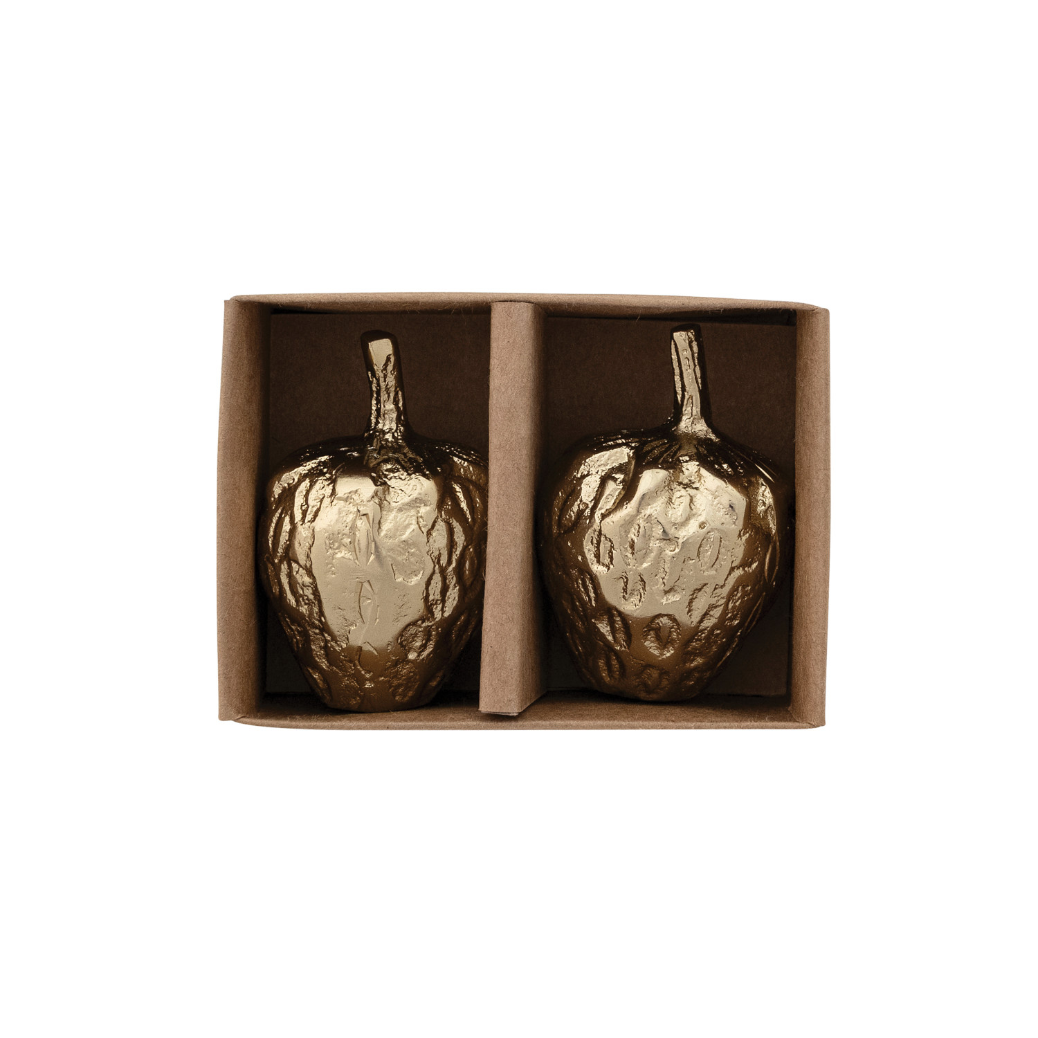 Cast Aluminum Strawberry Shaped Salt & Pepper Shakers, Gold Finish, Boxed Set of 2