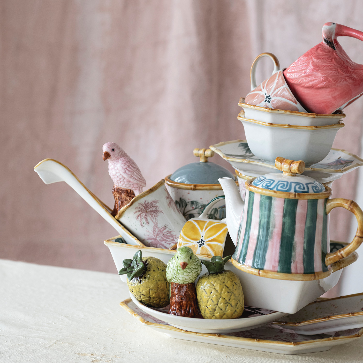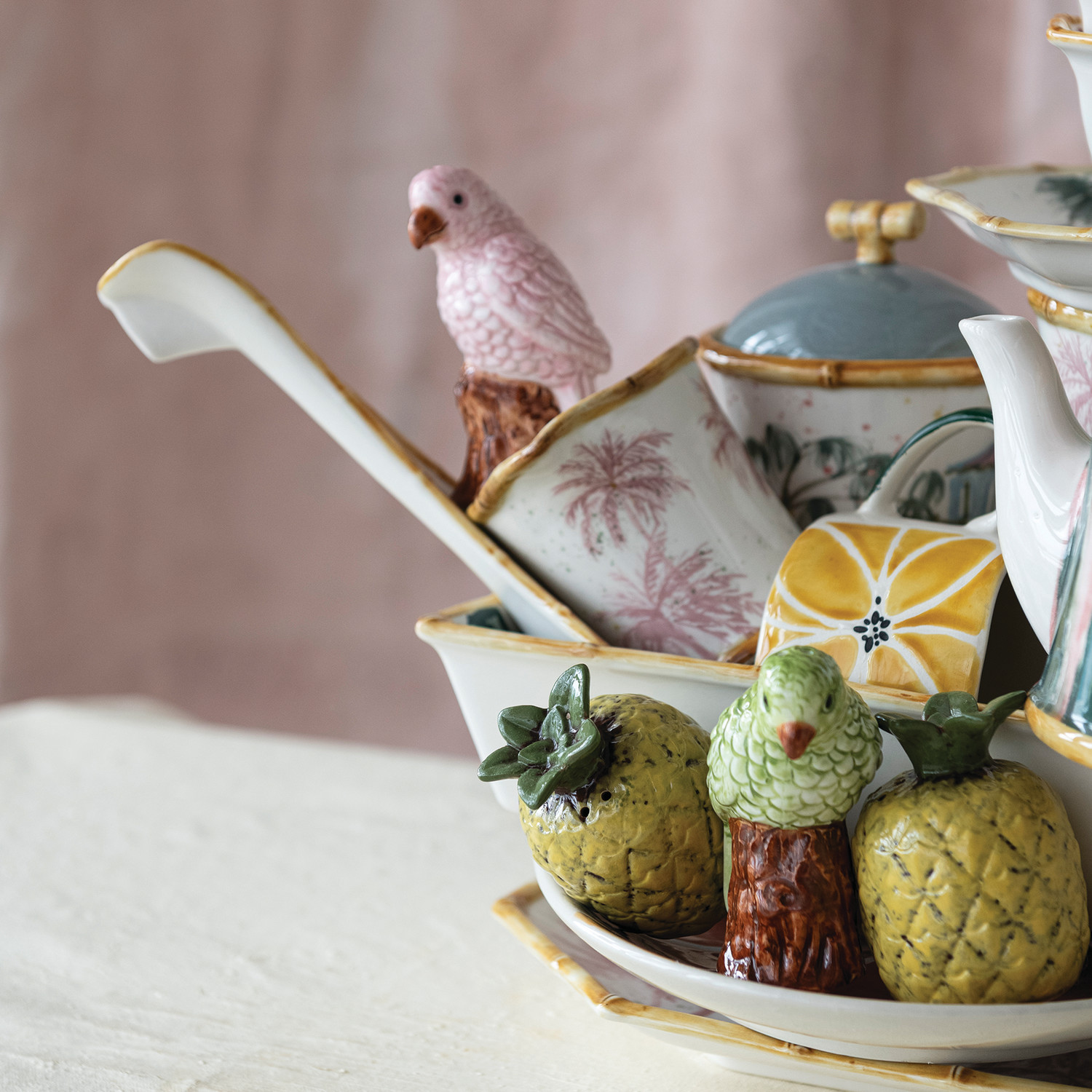 Hand-Painted Stoneware Parrot Shaped Salt & Pepper Shakers, Green, Pink & Brown, Set of 2