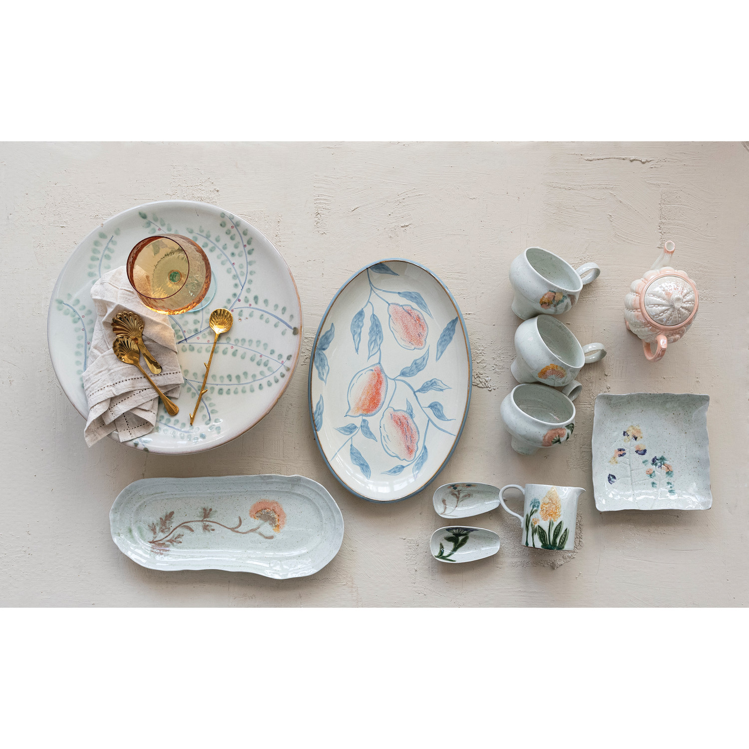 Hand-Painted Stoneware Organic Shaped Platter with Flowers (Each One Will Vary)