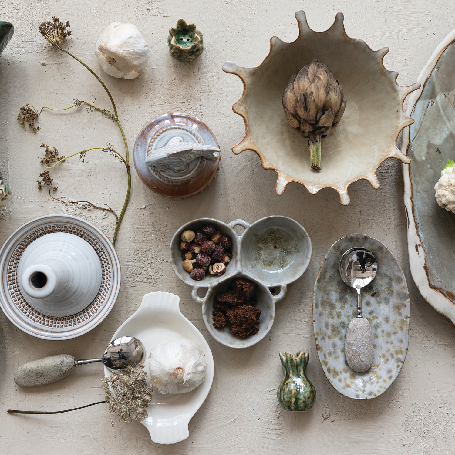 Catalog Name: 7-1/2"L x 4-1/4"W Stoneware Dish, Reactive Glaze, Cream Color & Brown (Each One Will Vary)