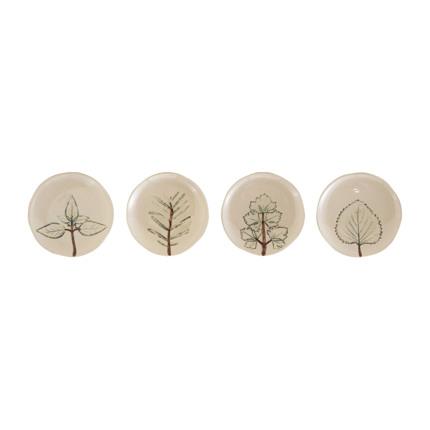 Catalog Name: 4-1/4" Round Hand-Painted Stoneware Dish w/ Botanical, Crackle Glaze, Cream Color, Green & Brown, 4 Styles (Each One Will Vary)