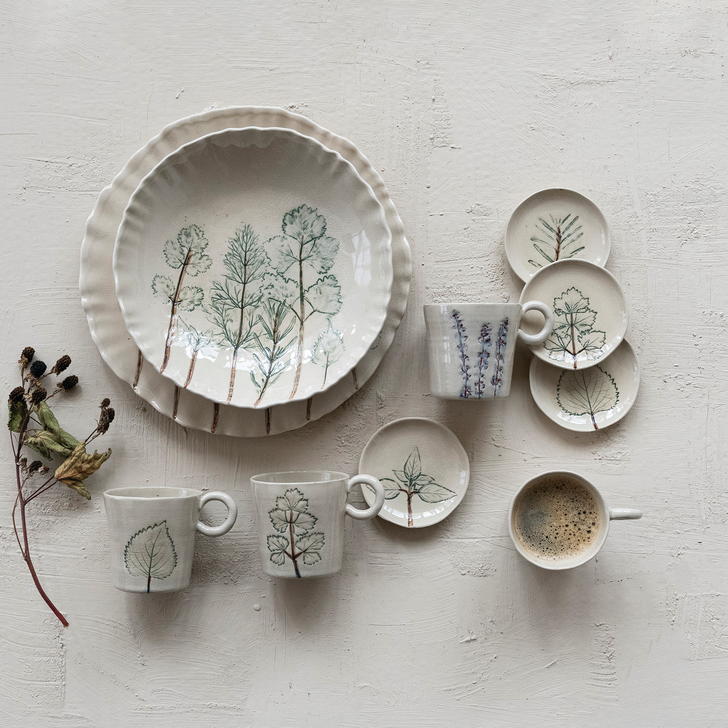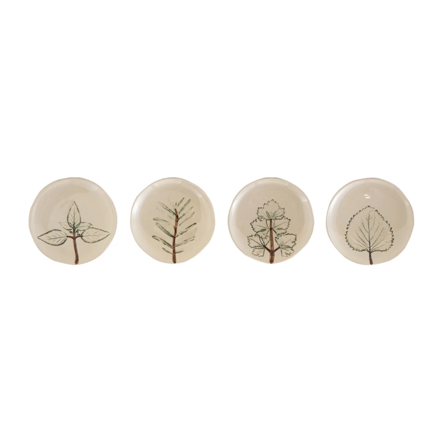 Hand-Painted Stoneware Dish with Botanical, Cream Color, 4 Styles (Each One Will Vary)