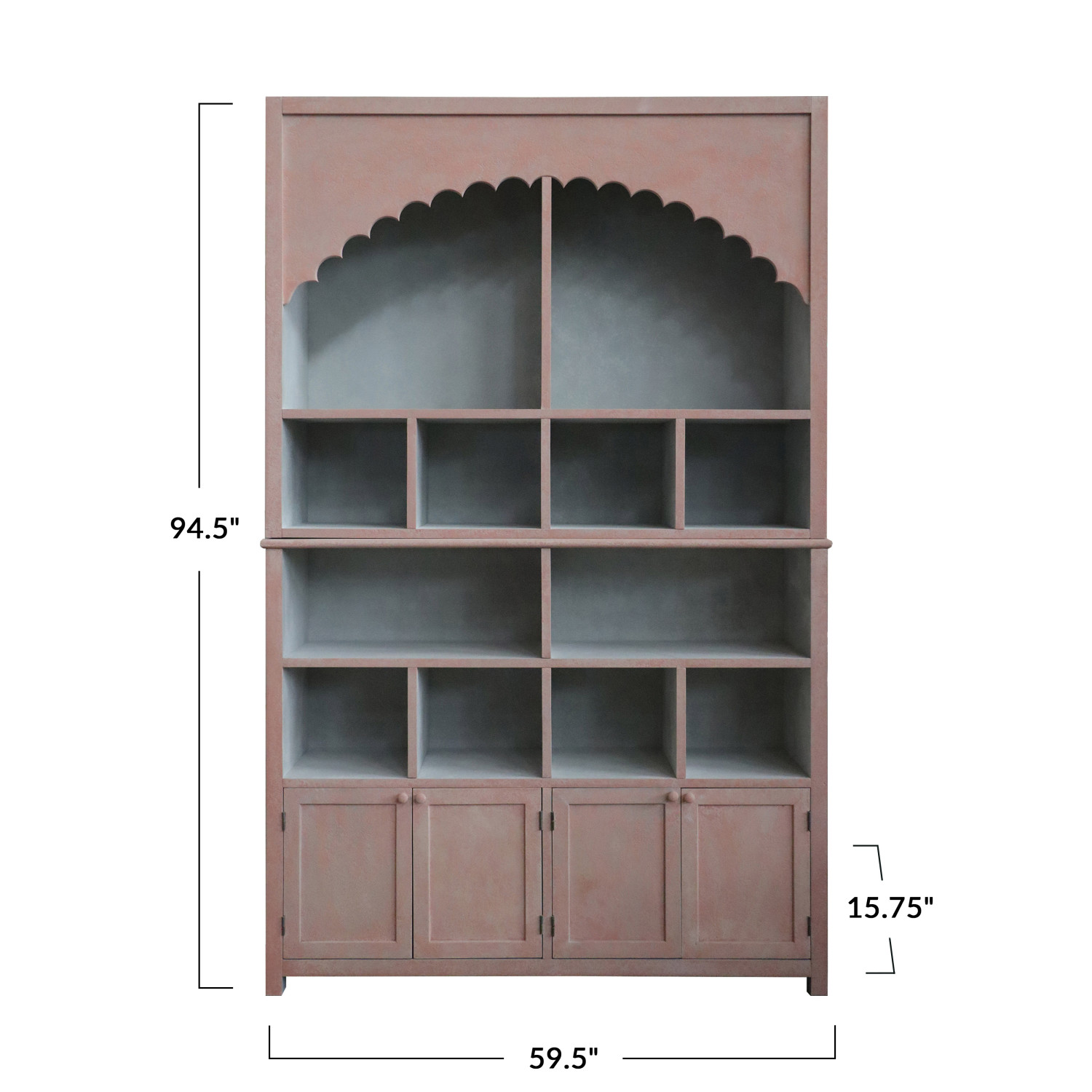 Catalog Name: 59-1/2"W x 15-3/4"D x 94-1/2"H Wood & MDF Cabinet w/ Scalloped Edge, 14 Compartments & 4 Doors, Antique Pink Finish, KD, Truck Ship