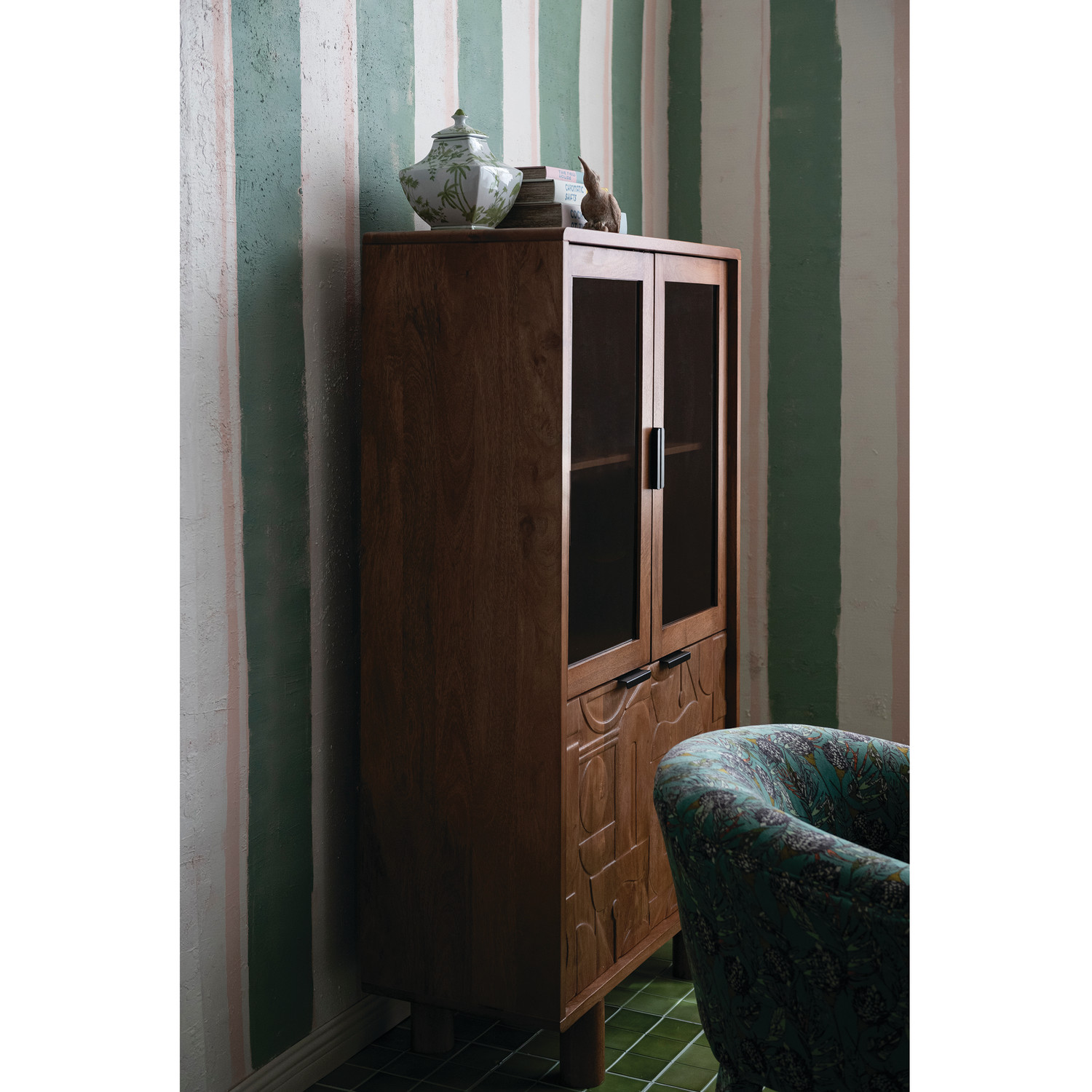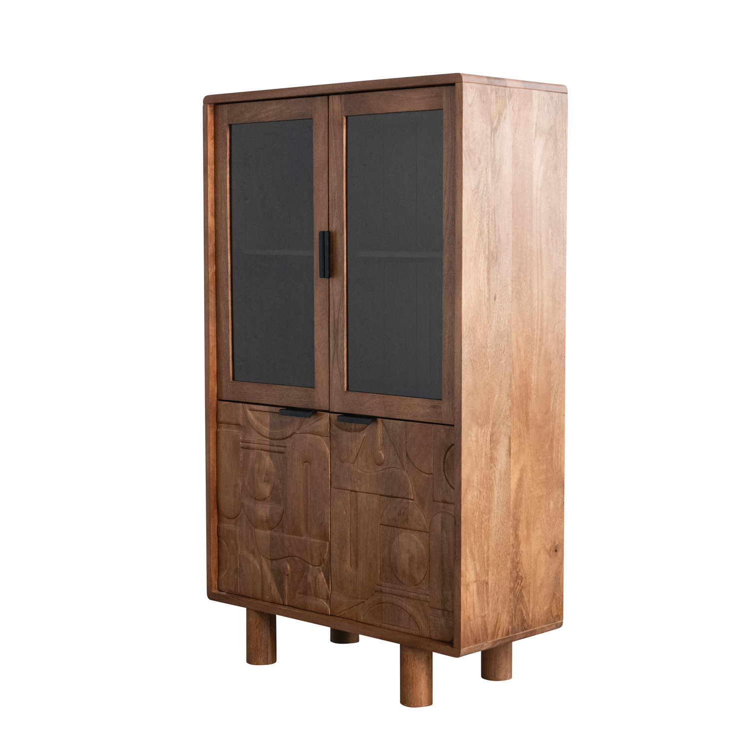 Catalog Name: 39"W x 17"D x 64"H Carved Mango & Acacia Wood Cabinet w/ 2 Glass Top Doors, 2 Bottom Doors & 4 Shelves, Natural, KD, Truck Ship