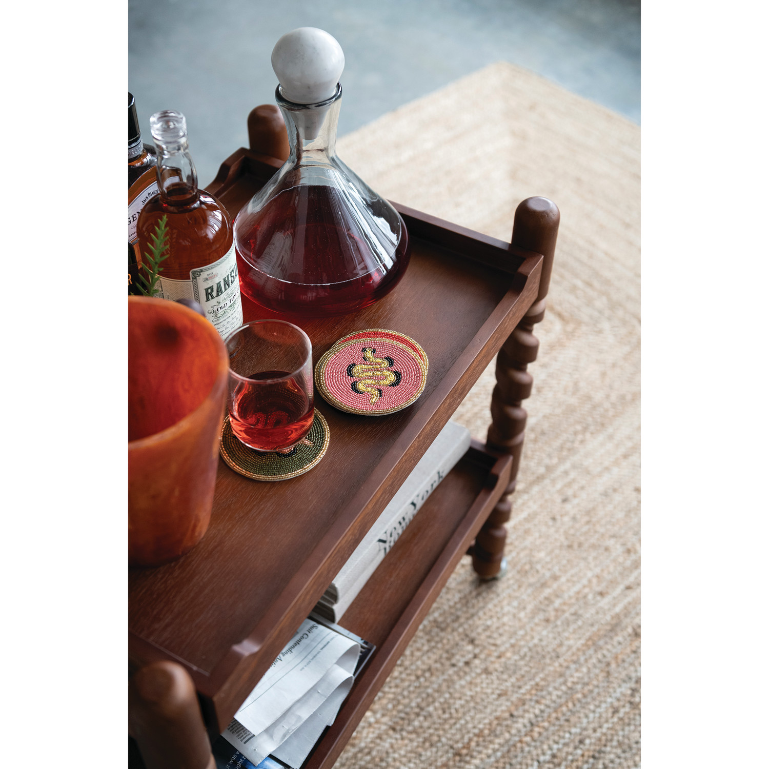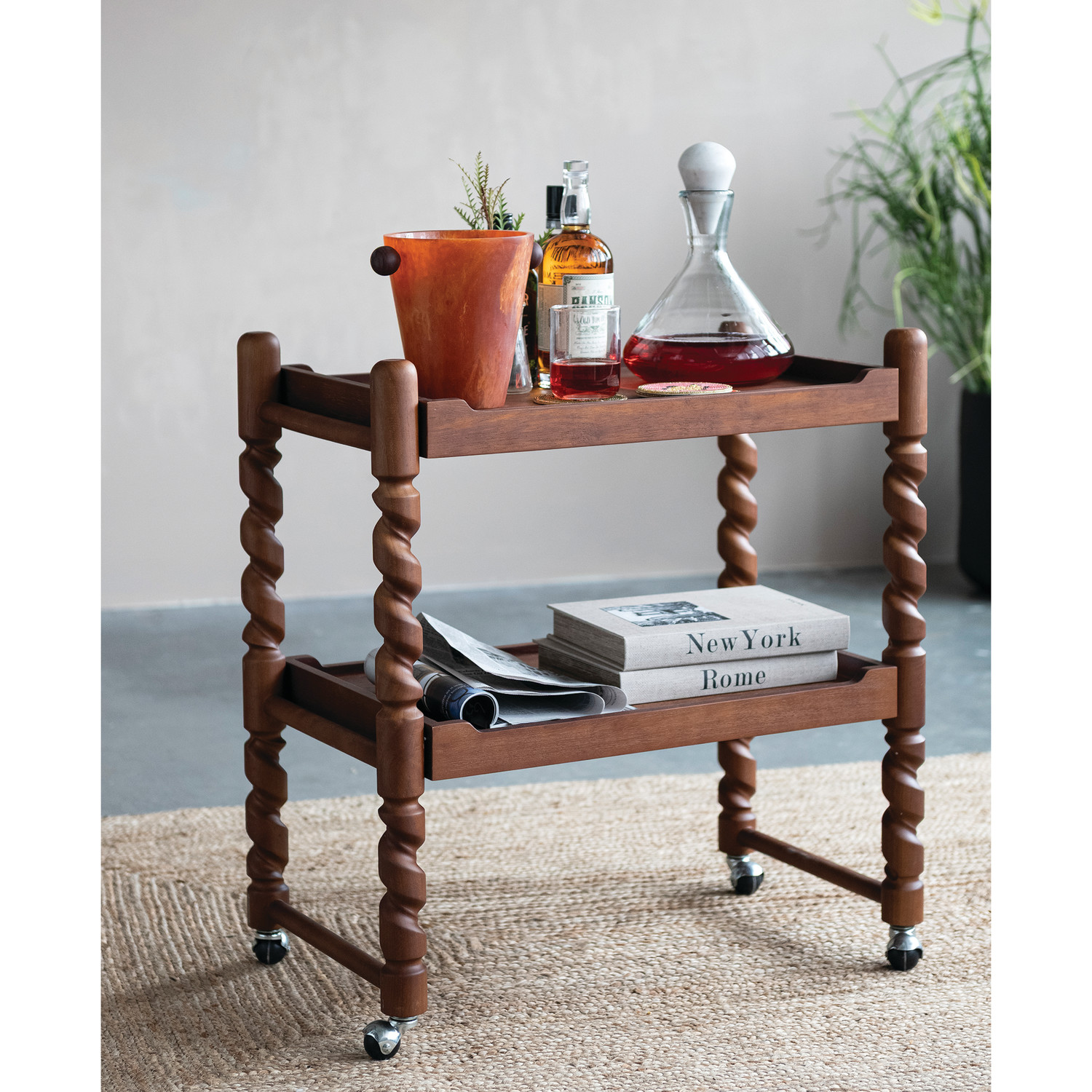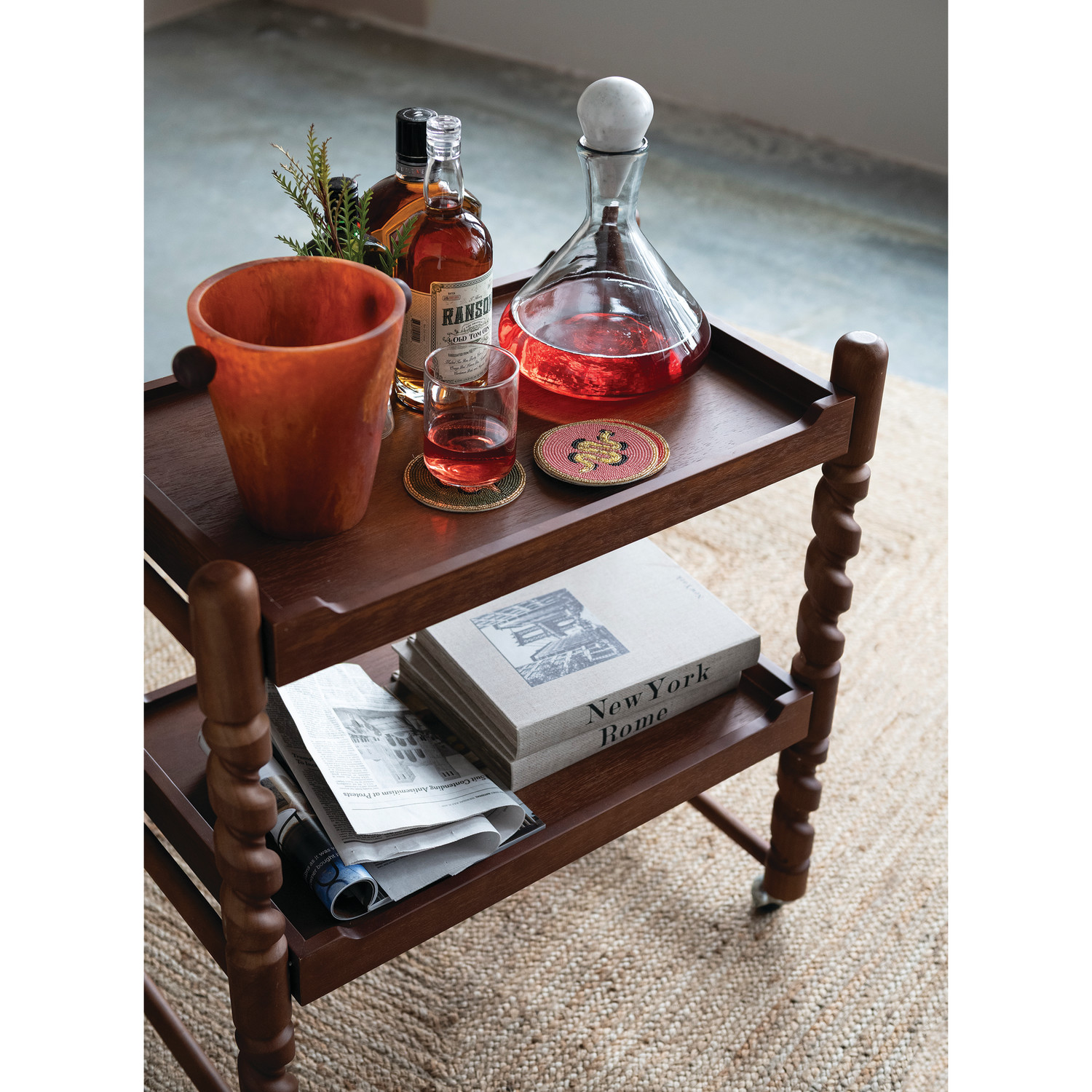 Brushed Rubberwood 2-Tier Bar Cart with Turned Legs on Casters, Walnut Finish, KD