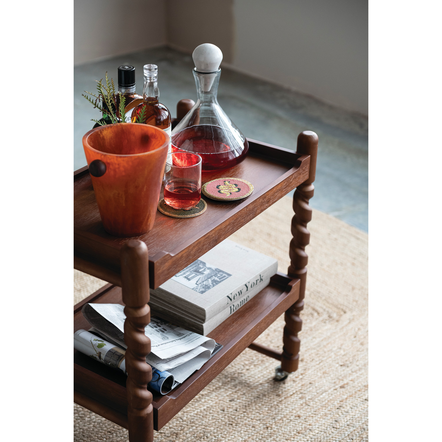 Catalog Name: 24"W x 15-3/4"D x 29-1/2"H Brushed Rubberwood 2-Tier Bar Cart w/ Turned Legs on Casters, Walnut Finish, KD