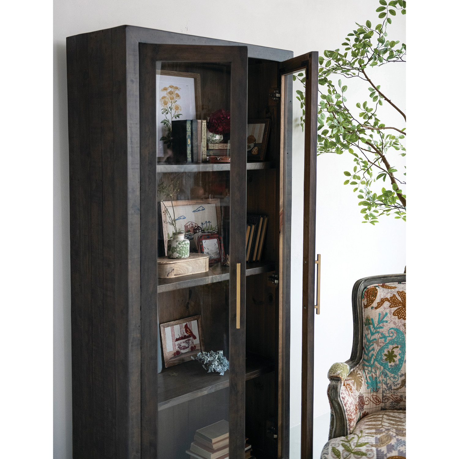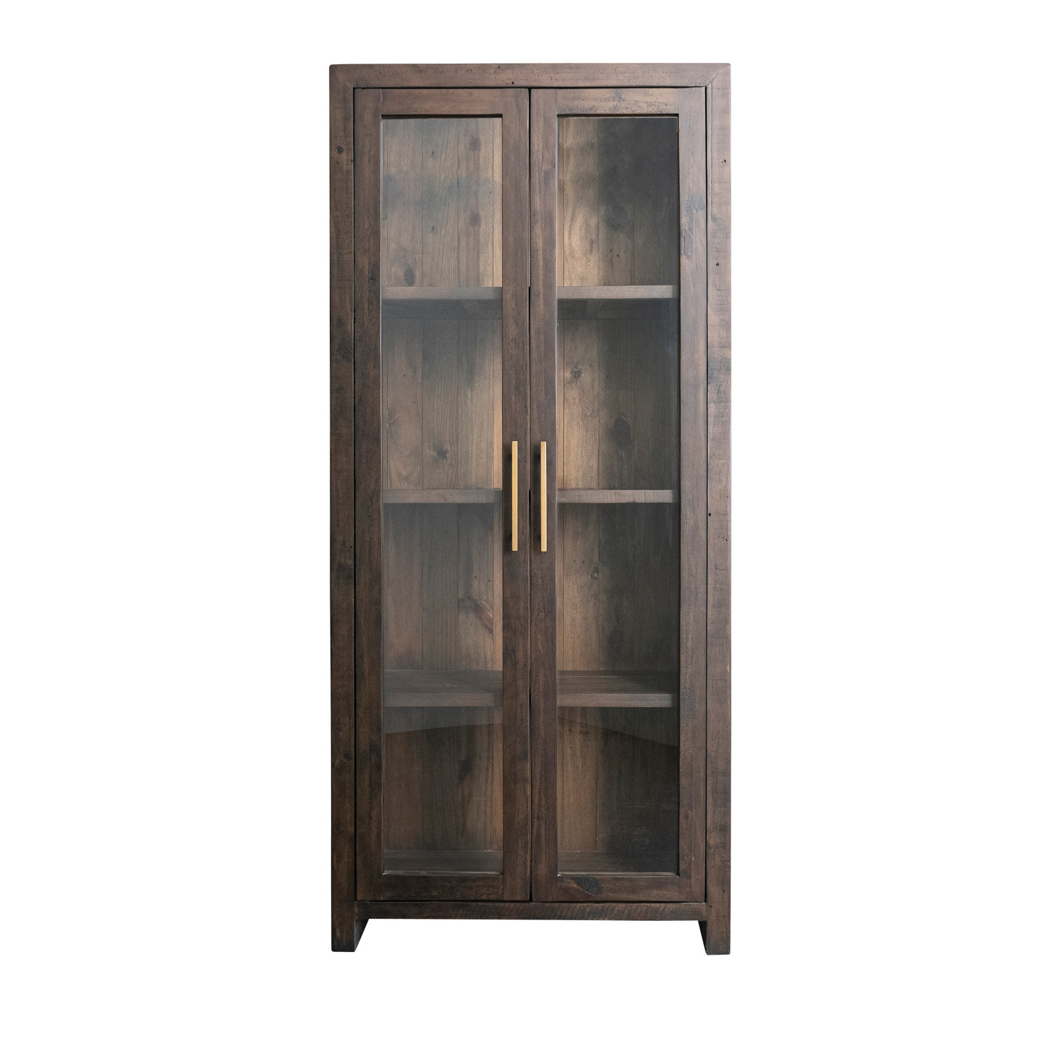 Catalog Name: 35"W x 15-3/4"D x 78-3/4"H Recycled Pine Wood Cabinet w/ 2 Glass Doors, 3 Shelves & Gold Finish Metal Handles, Walnut Finish, Truck Ship