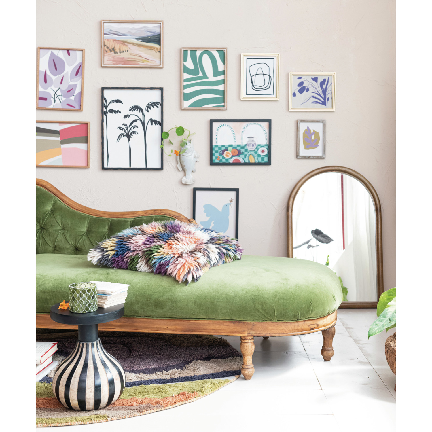 Catalog Name: 78"W x 32"D x 34"H Cotton Velvet Upholstered Chaise Lounge w/ Carved Mango Wood Frame, Green & Natural, Truck Ship