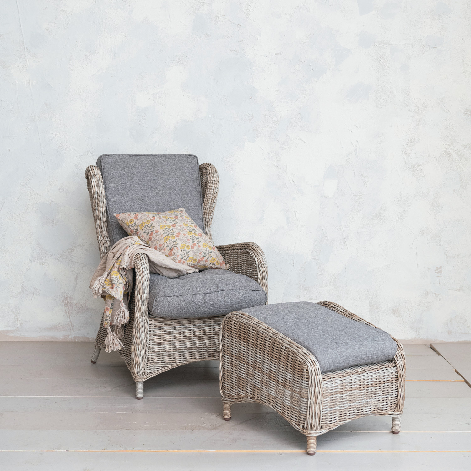 This Wicker Haven Chair and Ottoman Set invites anyone to indulge in the art of relaxation. The chair, standing 40.5 inches tall, is crafted with a sturdy aluminum frame and wrapped in the finest wicker, offering both resilience and aesthetic appeal. The accompanying ottoman, upholstered in soft polyester, provides a comfortable extension for the legs, completing the set's invitation to unwind. With its square design and natural grey hues, the set is a perfect match for homes that celebrate the eclectic spirit of boho, the warmth of farmhouse style, or the unique flair of eclectic decor. It's not just furniture; it's a lifestyle choice that promises comfort and style in equal measure.