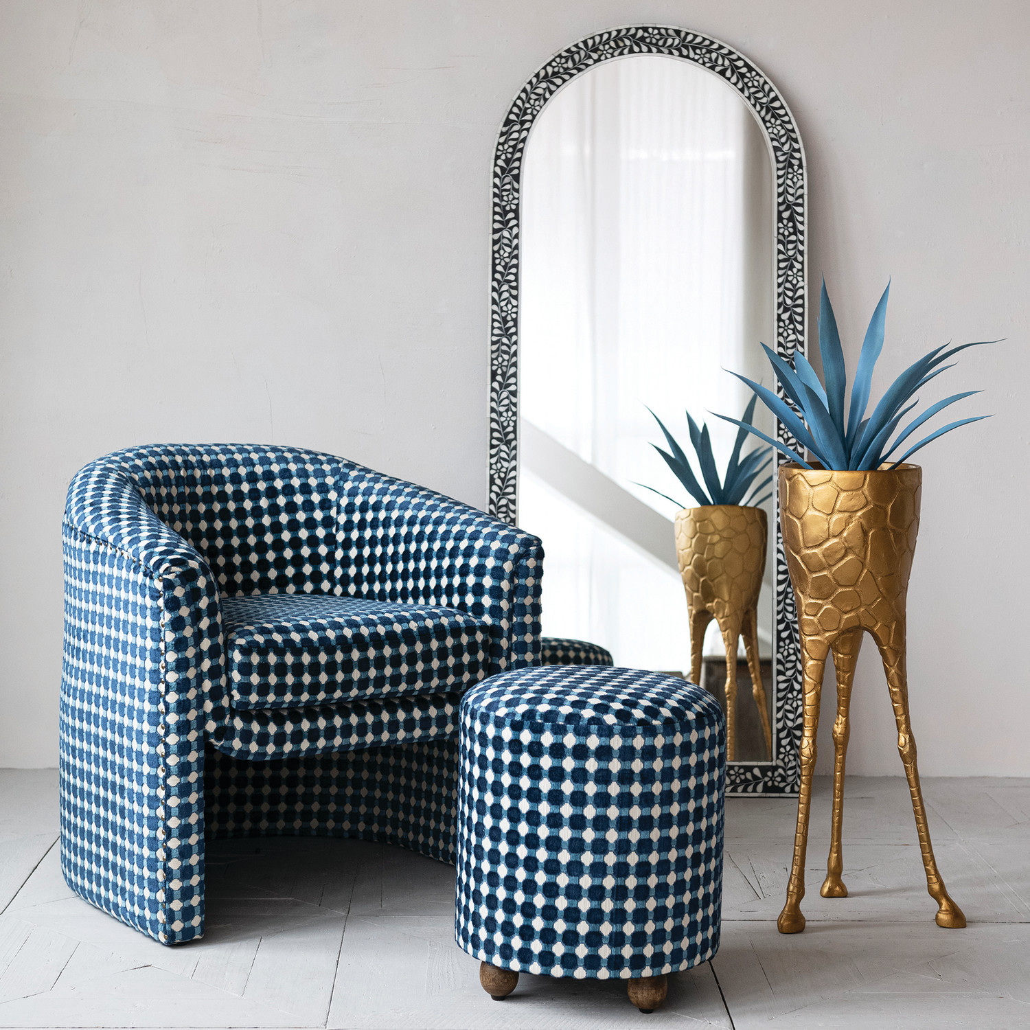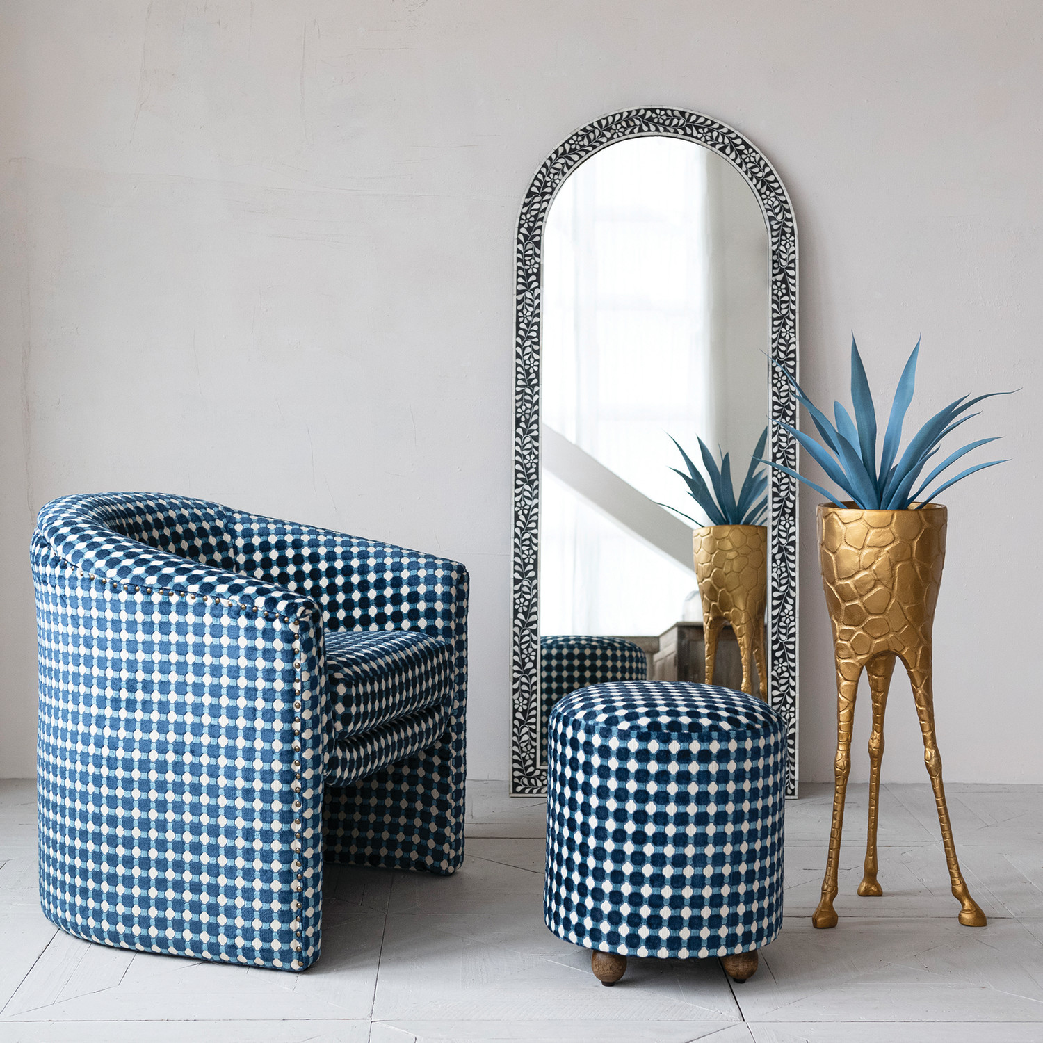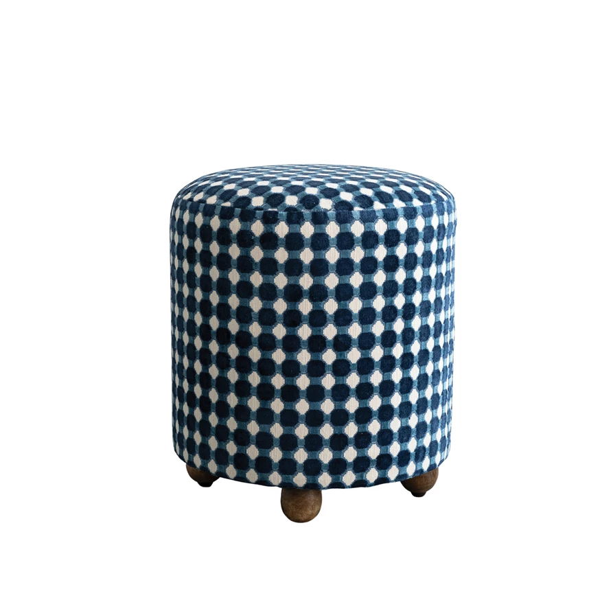 Burnout Velvet Upholstered Stool with Dot Pattern & Mango Wood Feet, Blue