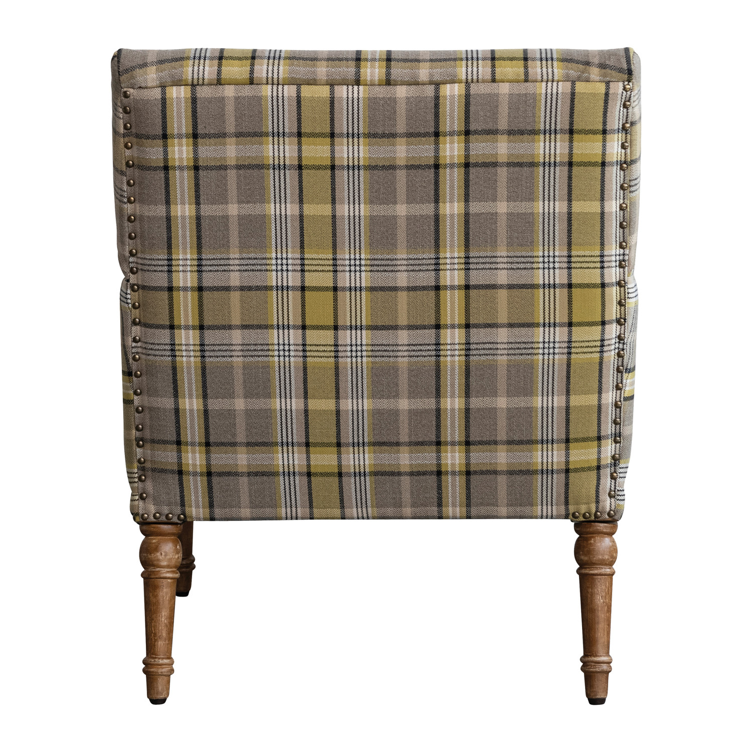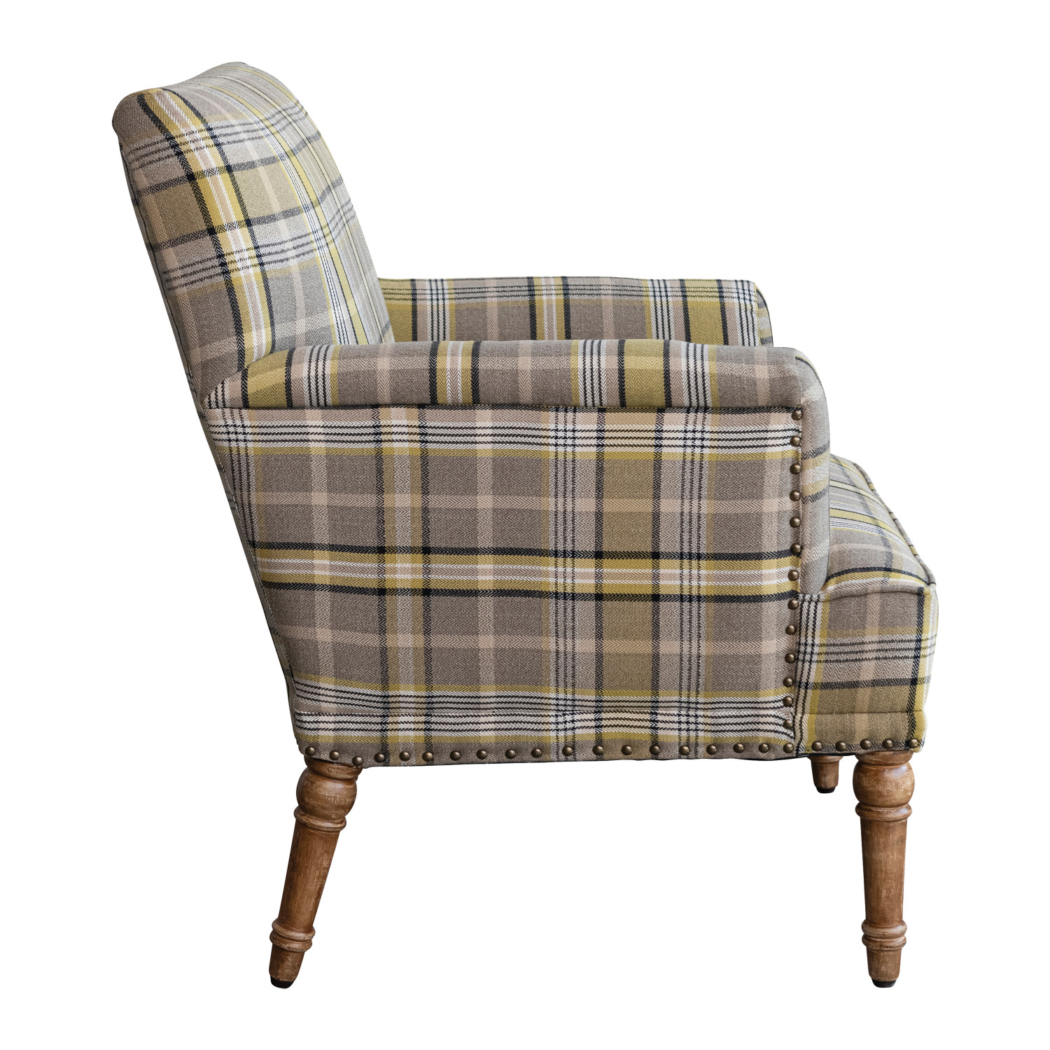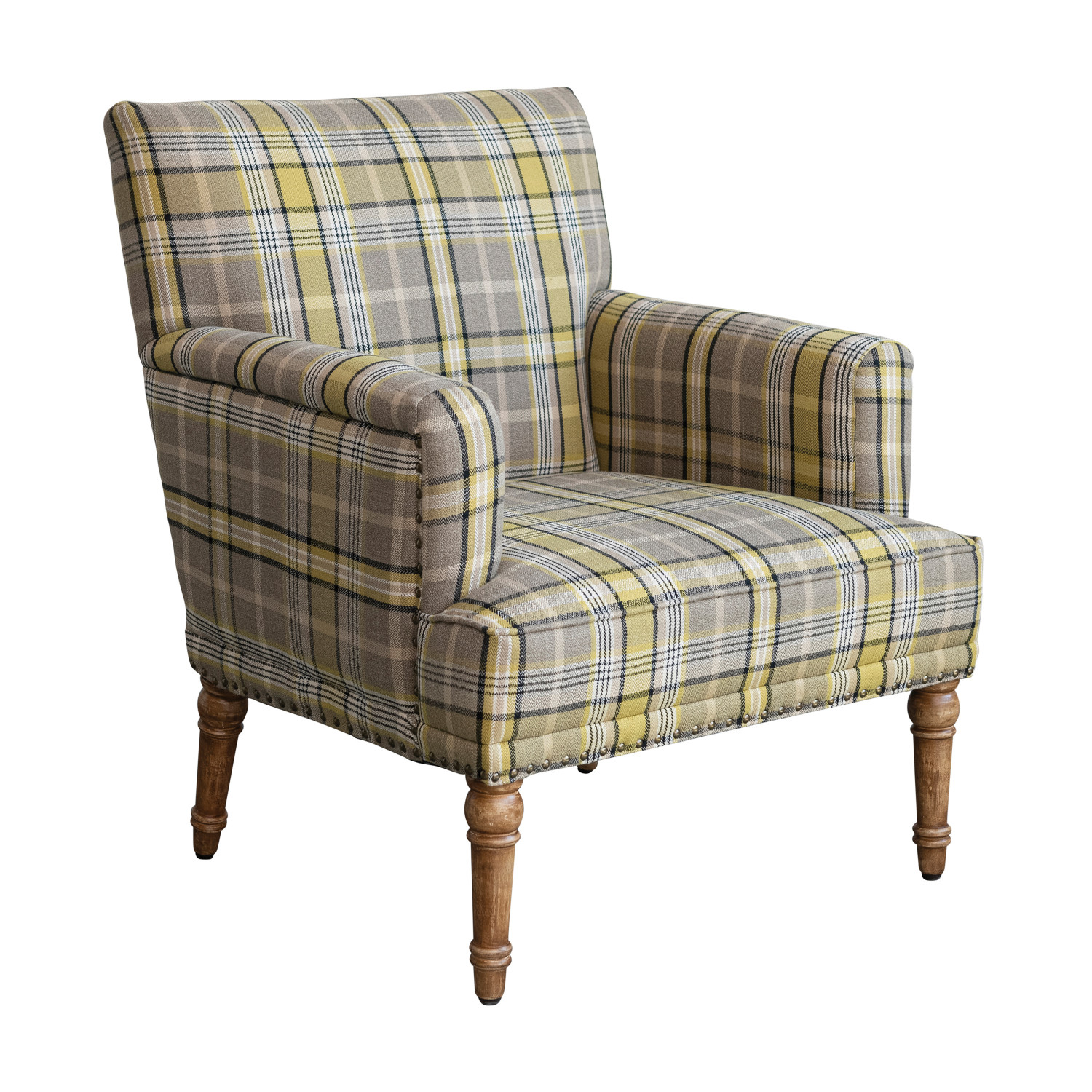 Fabric Upholstered Chair with Plaid Pattern, Mango Wood Legs & Nail Heads & Natural