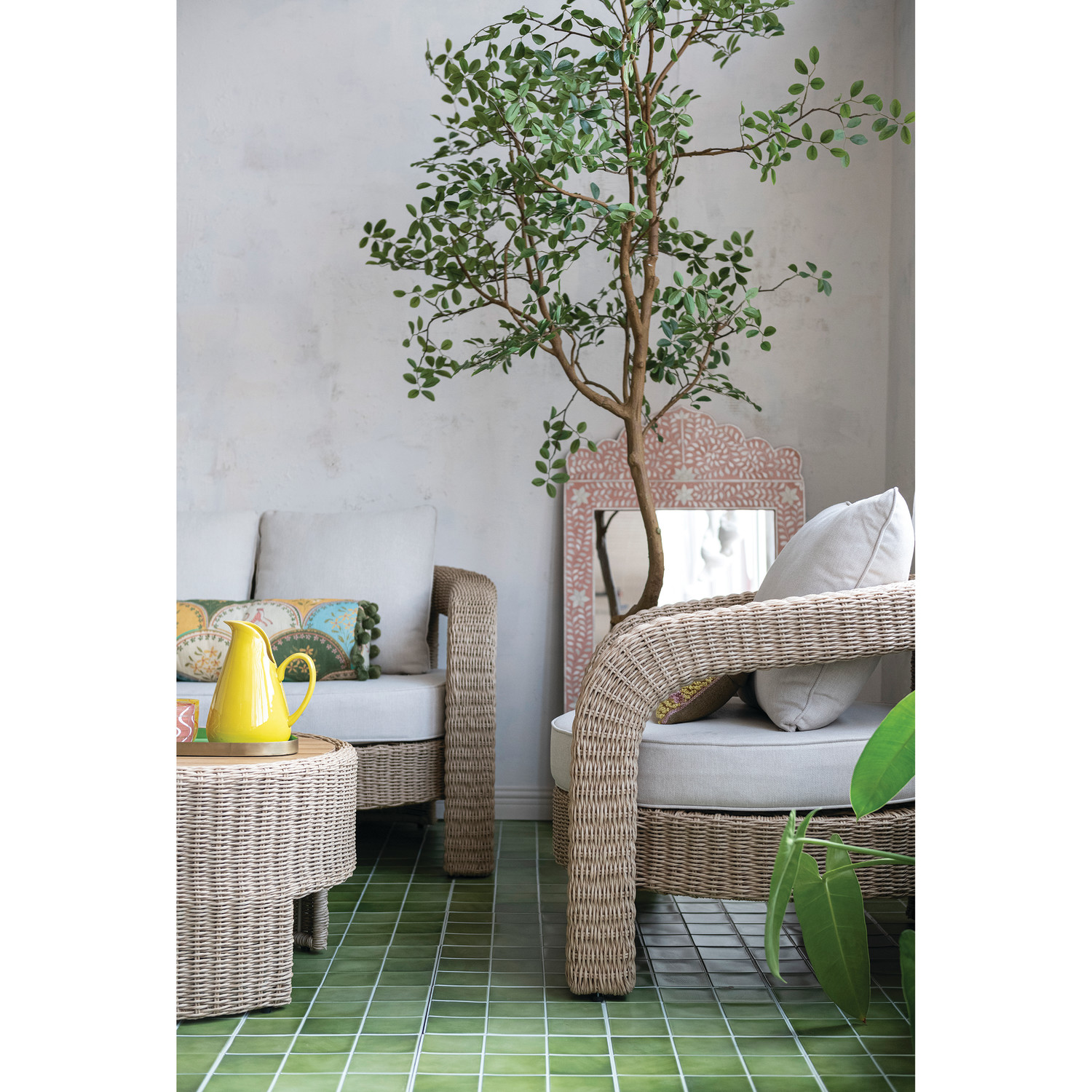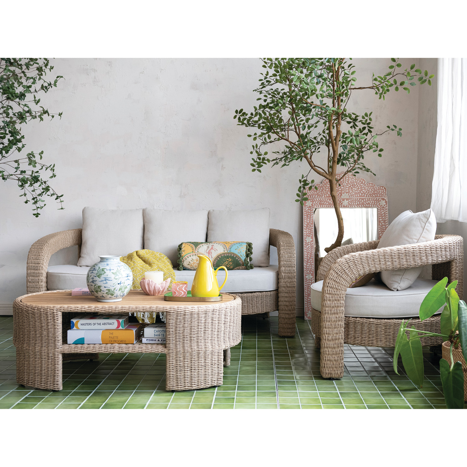 Catalog Name: 73"W x 32-1/4"D x 34"H Hand-Woven Plastic Indoor/Outdoor Sofa & (2) 46"W x 26-1/4"D x 17-1/4"H Plastic Wicker Chairs w/ 48"L x 26-1/4"W x 17-1/4"H Oval Acacia Wood Table & Fabric Cushions, Natural & Cream Color, Set of 4, Truck Ship