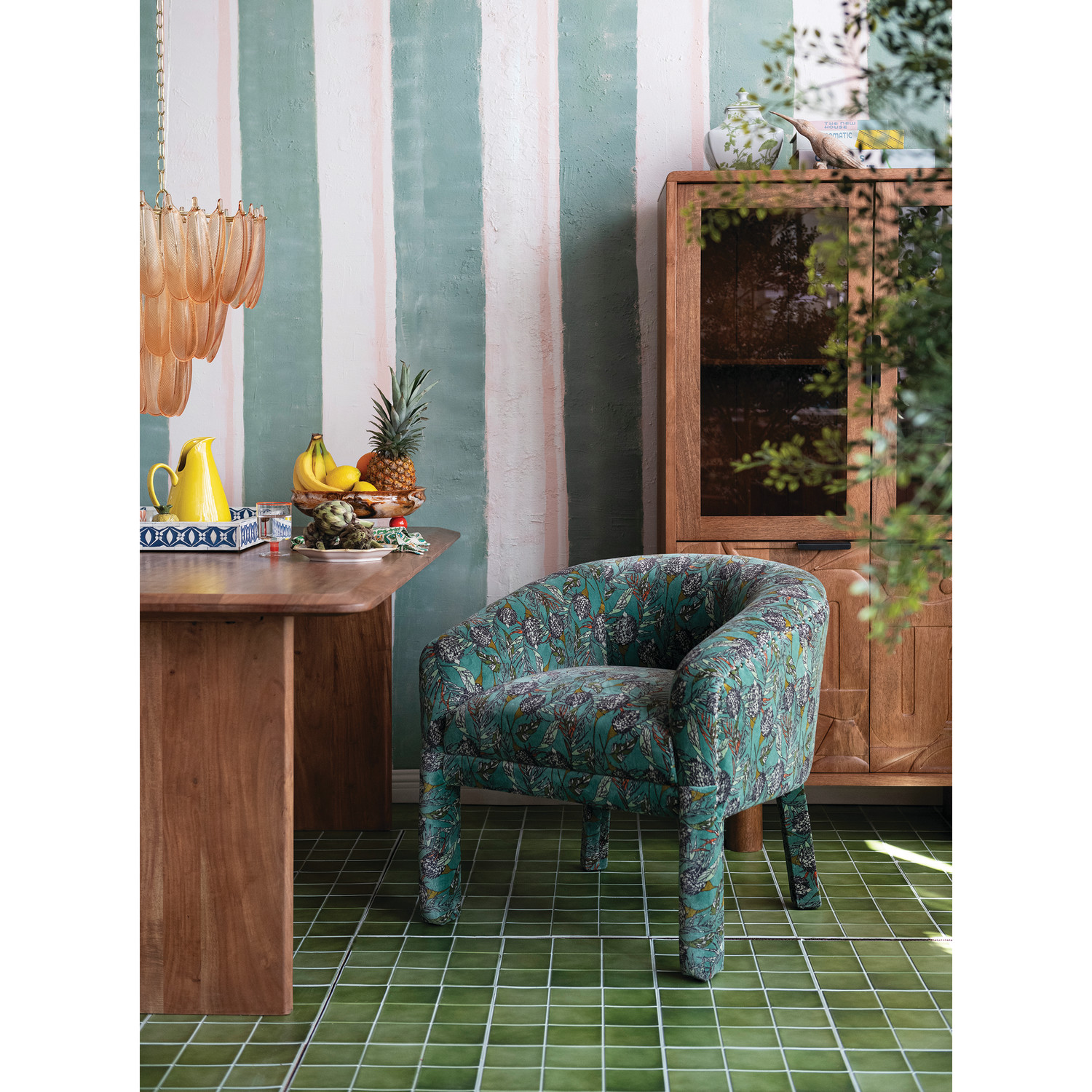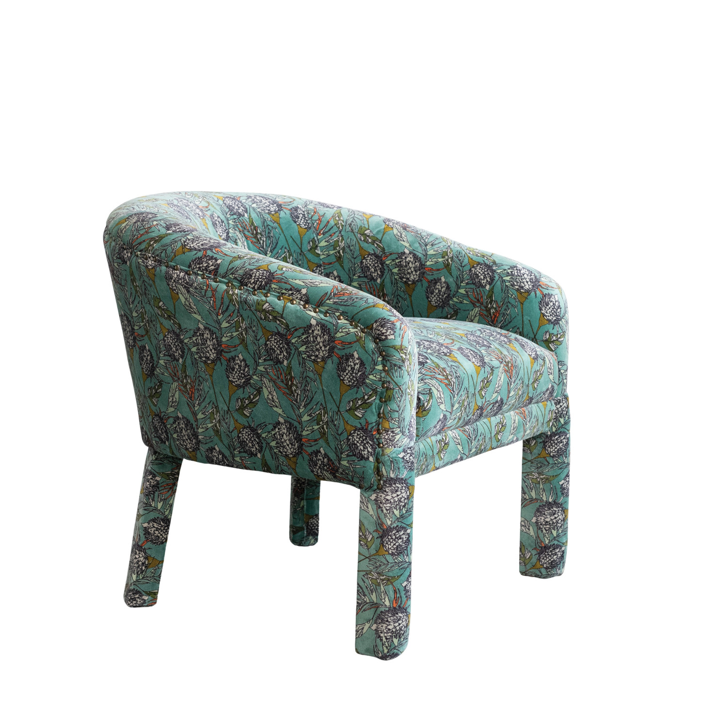 Cotton Velvet Upholstered Arm Chair with Botanical Pattern & Nail Heads