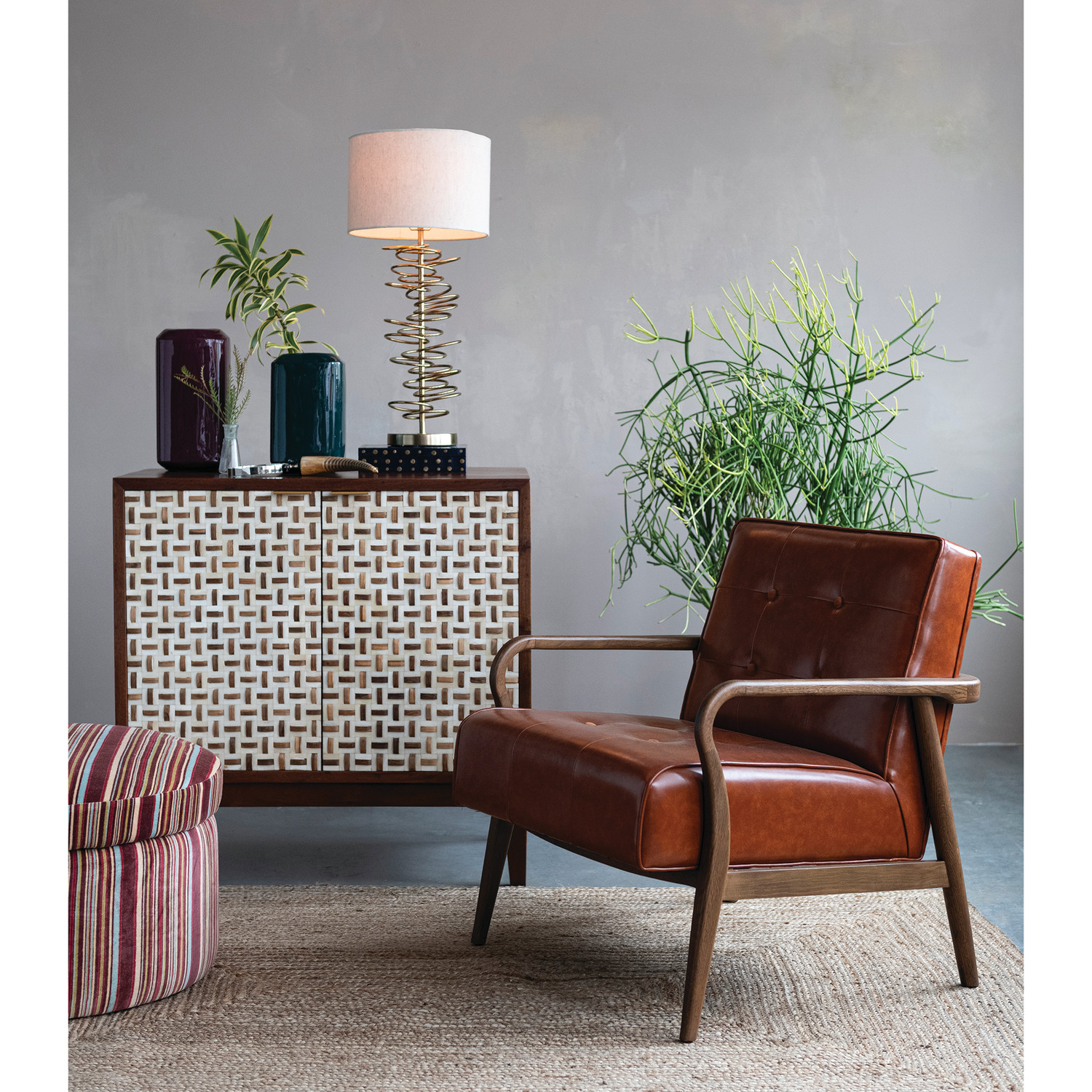 Oak Wood & Faux Leather Tufted Arm Chair, Natural & Cognac Color