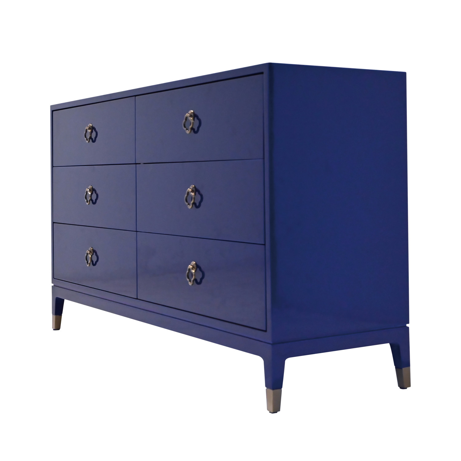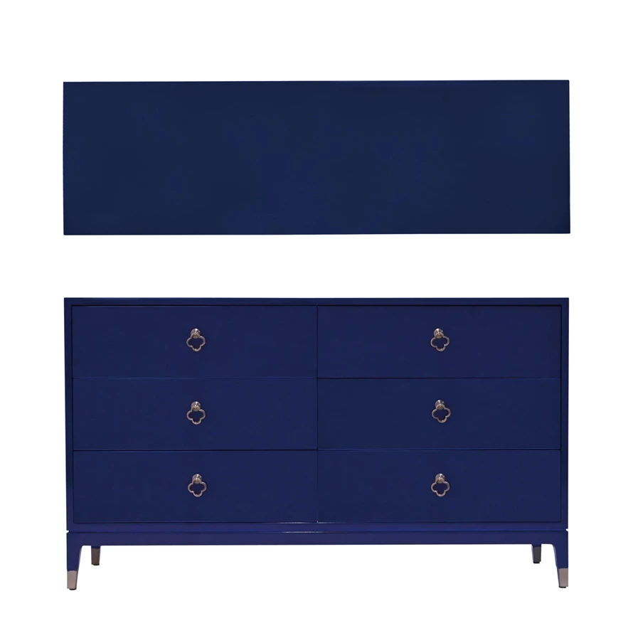 Catalog Name: 51"W x 15-3/4"D x 29-1/2"H Wood Lacquered Console Table w/ 6 Drawers & Metal Clover Shaped Pulls, Navy Color & Gold Finish, Truck Ship