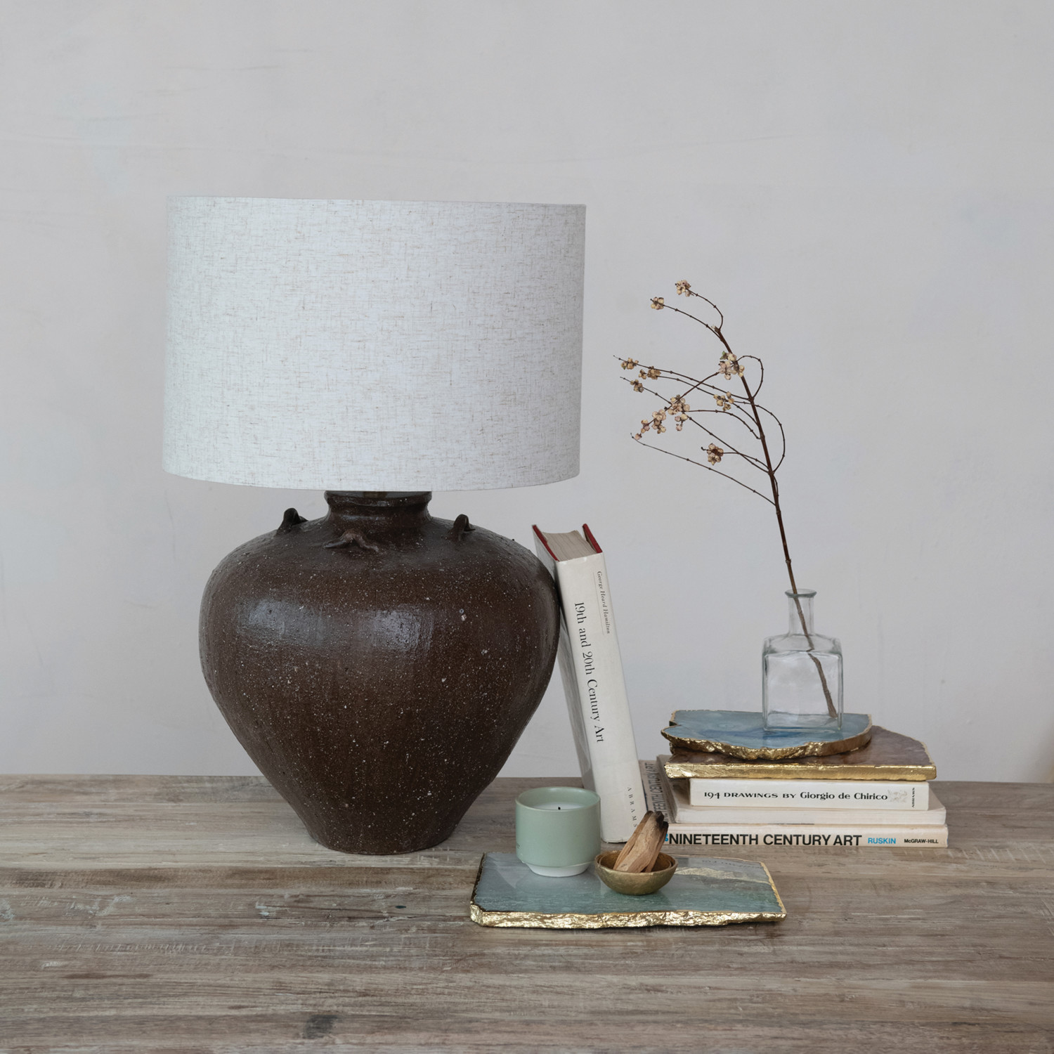 Textured Stoneware Table Lamp w/ Linen Shade & Inline Switch, Brown