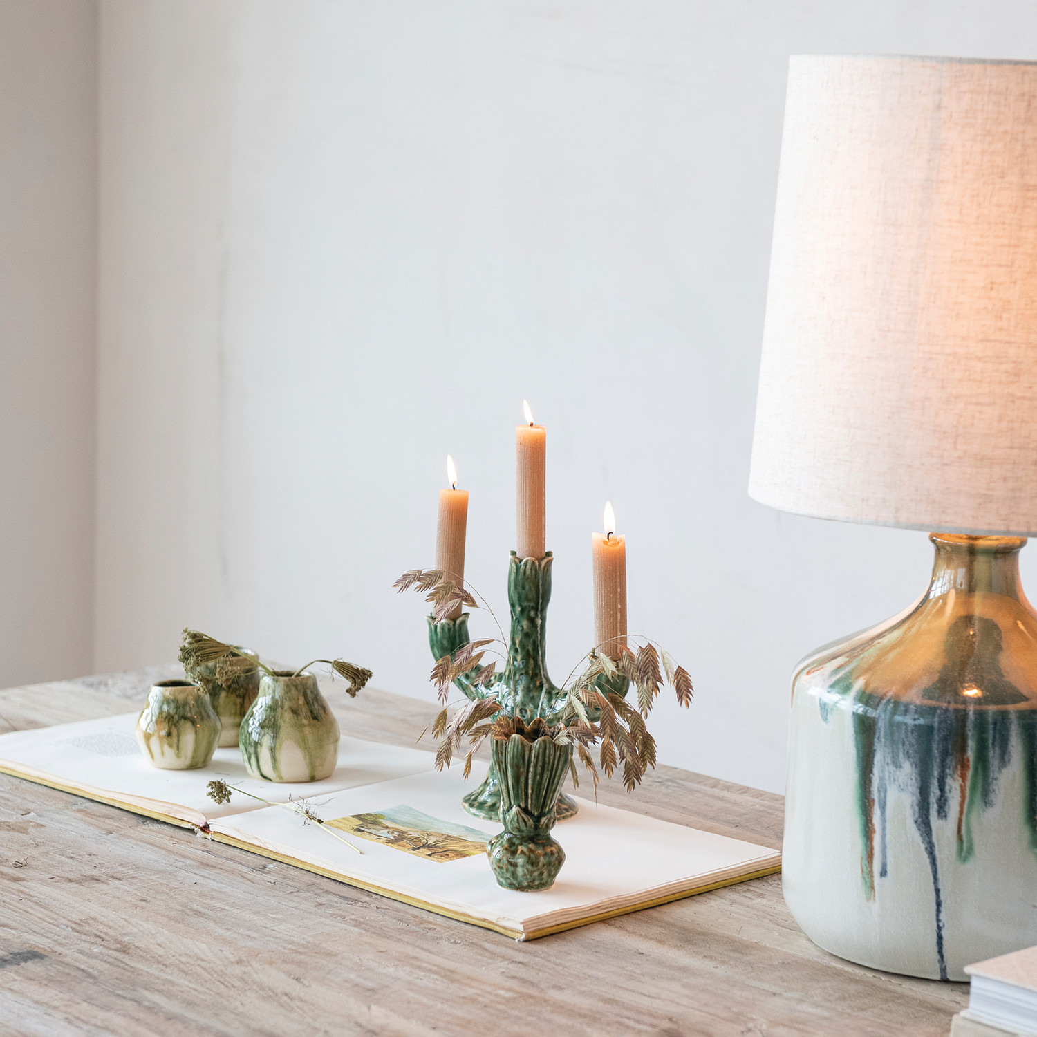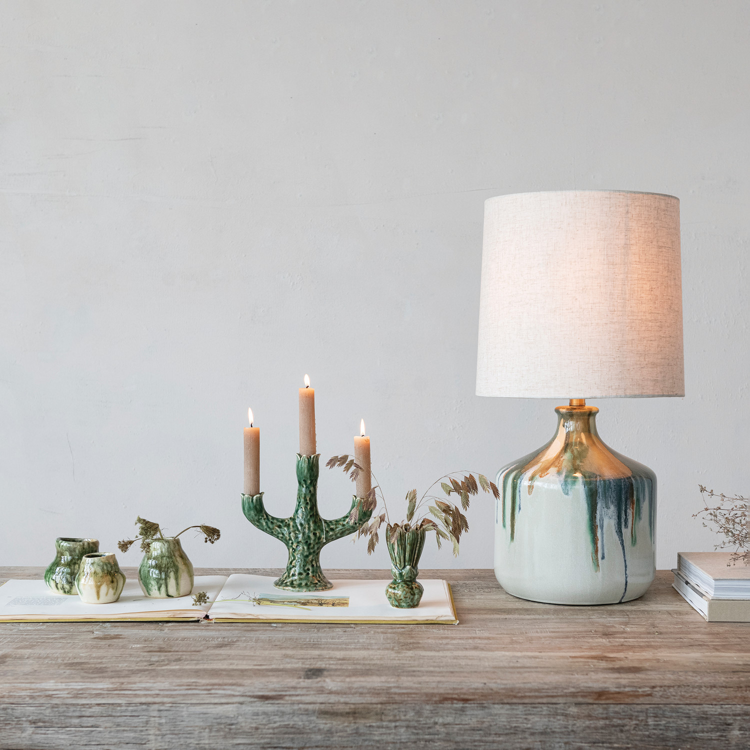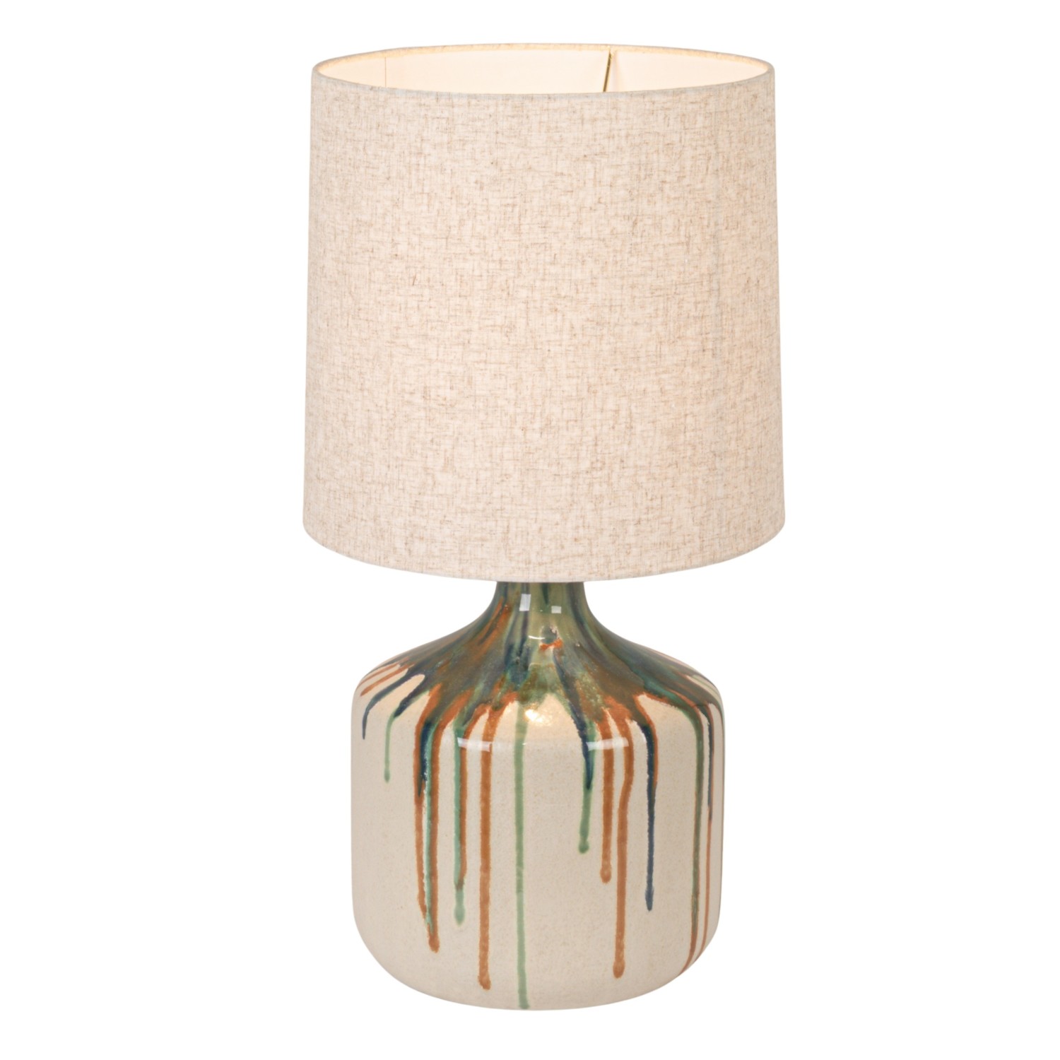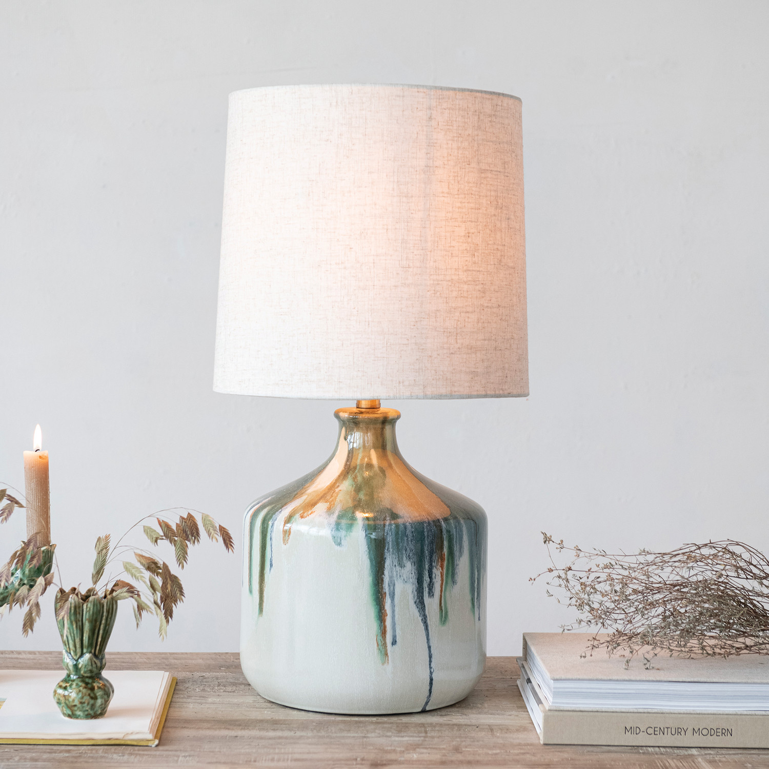 Catalog Name: 12" Round x 23-1/2"H Stoneware Table Lamp w/ Linen Shade & Inline Switch, Reactive Glaze, Multi Color (Each One Will Vary)