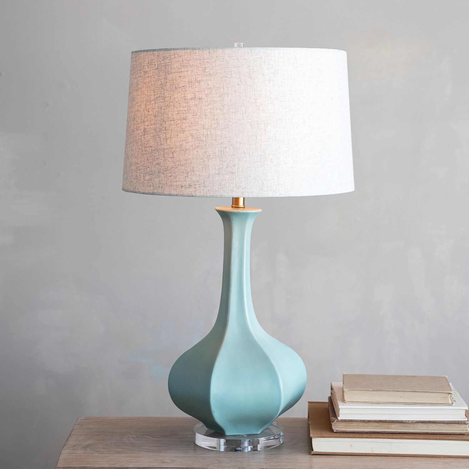 Stoneware Pleated Table Lamp with Acrylic Base & Linen Shade, Teal & Gold Finish