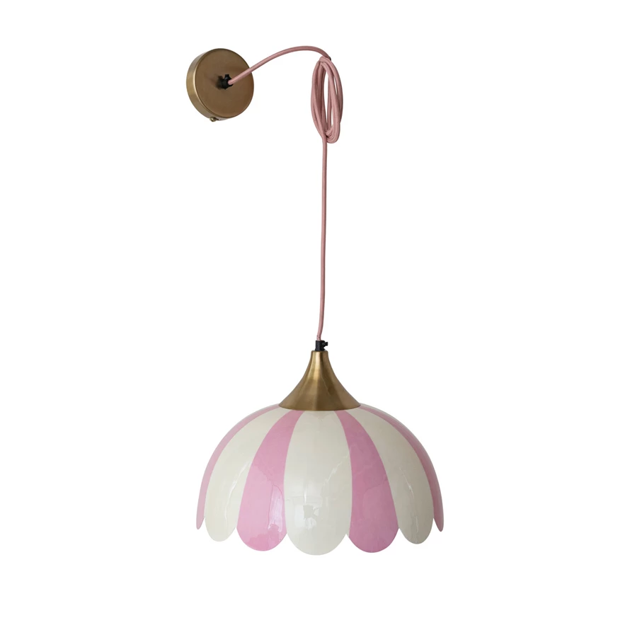 Catalog Name: 15" Round x 11"H Enameled Metal Scalloped Striped Pendant Lamp, 6' Fabric Cord, Pink, Cream Color & Gold Finish (Hardwire Only)