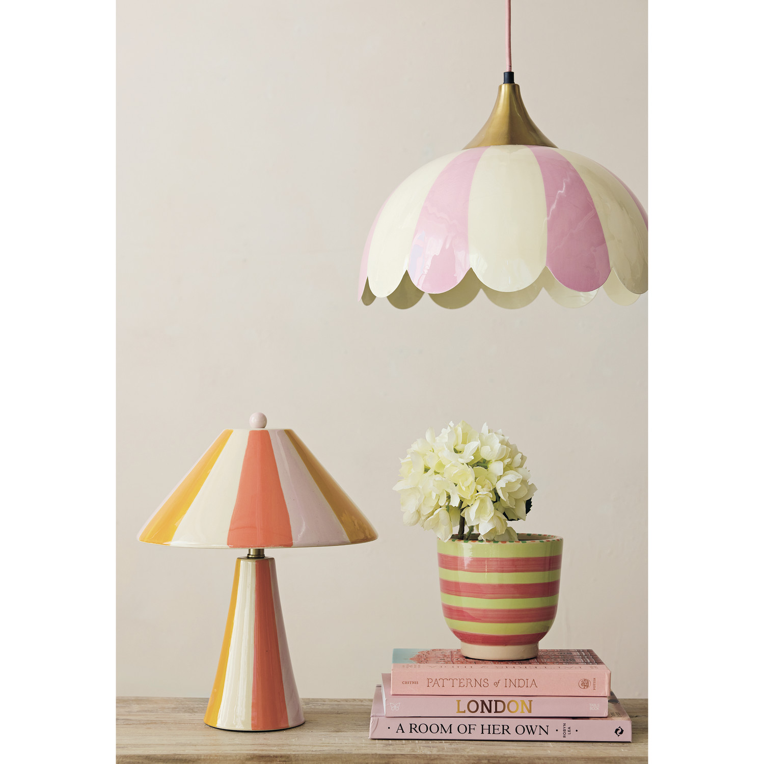 Enameled Metal Scalloped Striped Pendant Lamp, 6' Fabric Cord