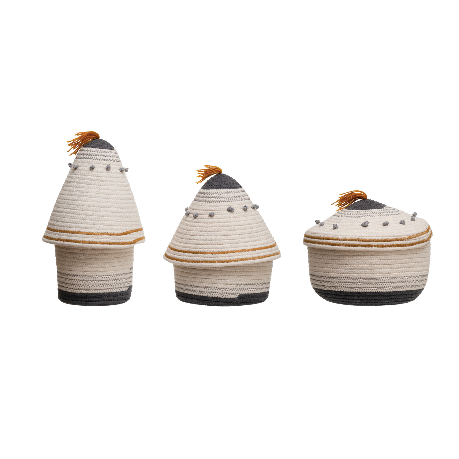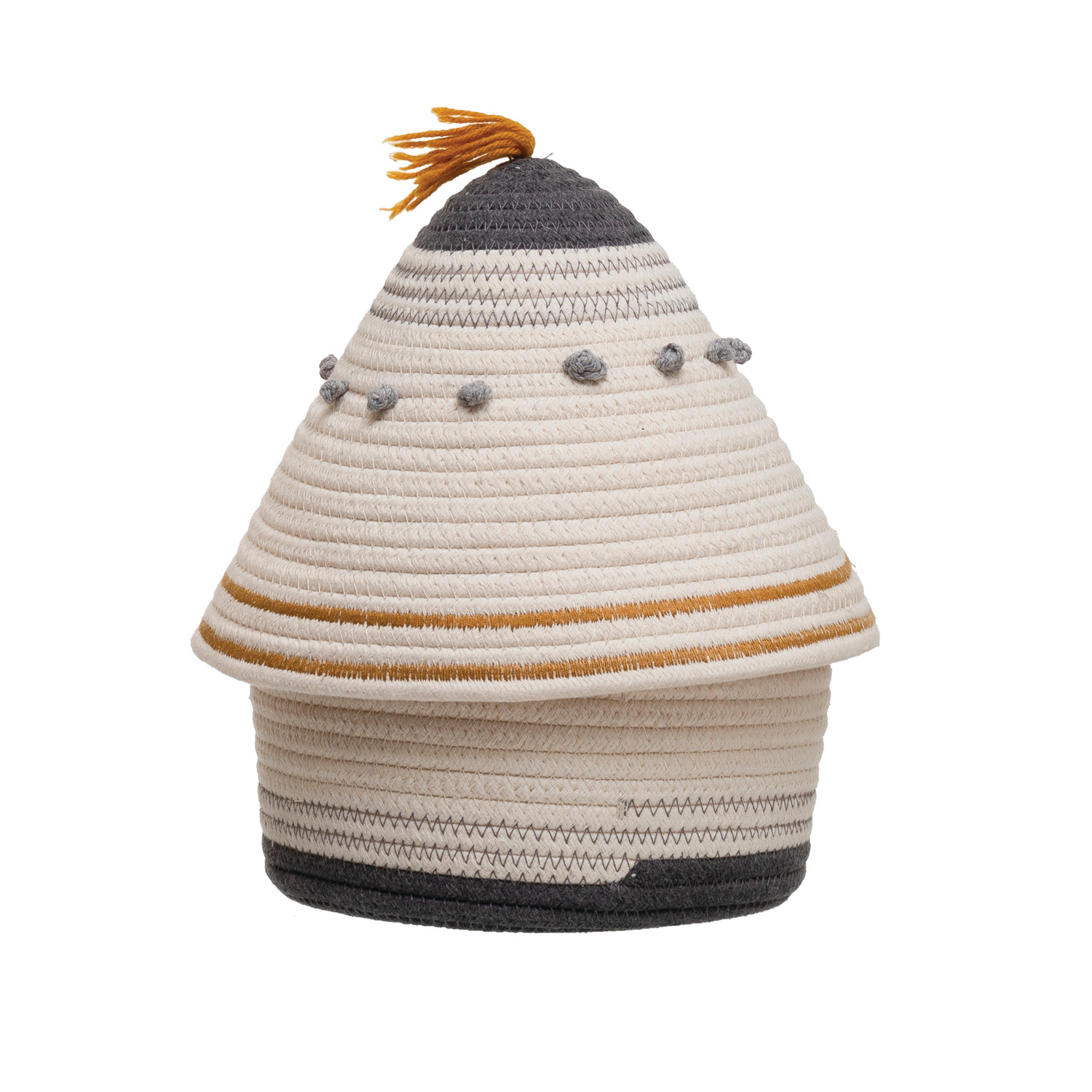 Catalog Name: 9-1/2" Round x 11"H Cotton Rope Basket w/ Lid & Embroidery, Grey & Mustard Color