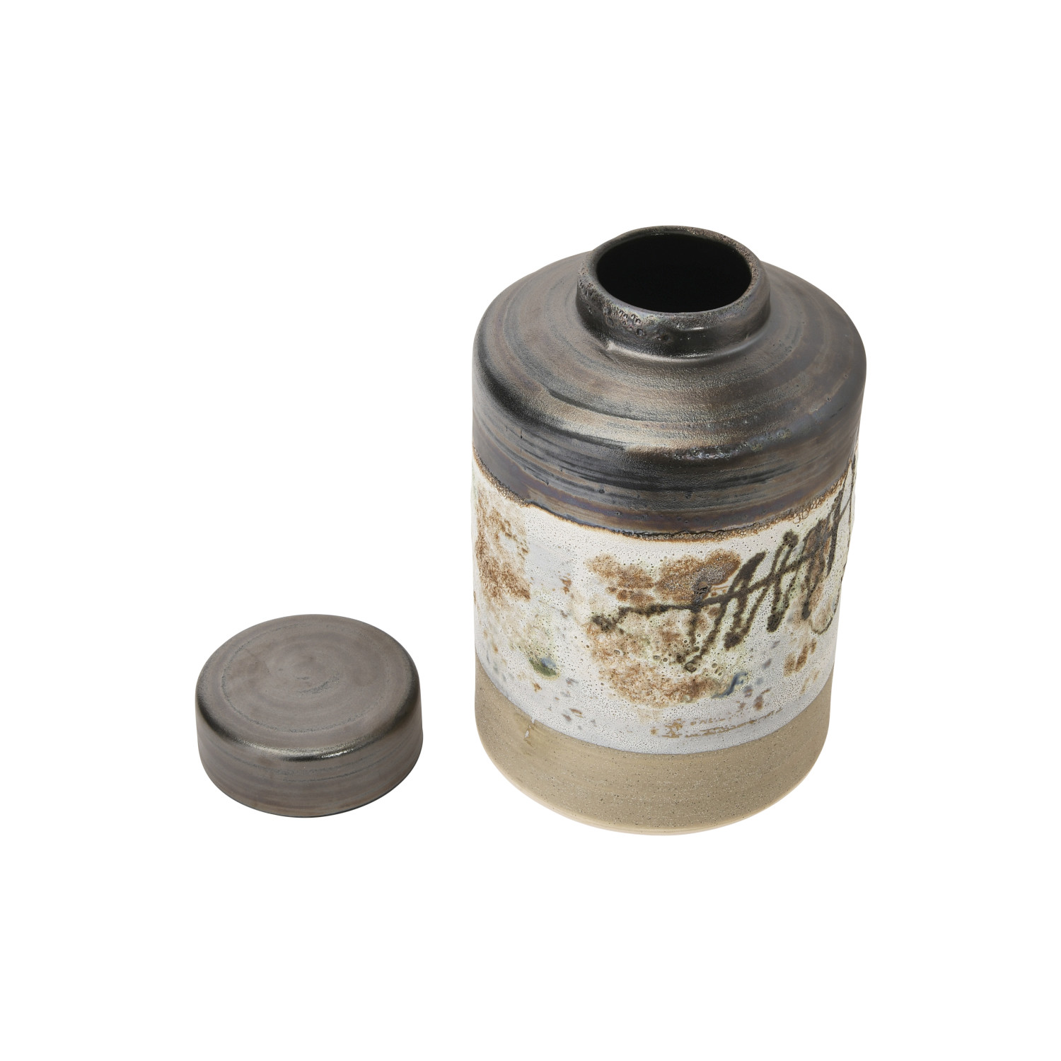 This hand-painted stoneware ginger jar with a lid adds spice to any home. The gorgeous jar features a reactive glaze that creates a unique pattern of colors and textures on the surface. The jar is adorned with hand-painted floral motifs that enhance its charm and appeal. It can be used as a vase for fresh flowers, a cookie jar for delicious treats, or a decorative accent on a shelf or mantel. The jar brings warmth and style to any room. It is made of durable stoneware with a glossy finish and a matching lid that fits snugly on top. It measures 8.5 inches round and 13.5 inches in height and is easy to clean with a damp cloth. This hand-painted stoneware ginger jar with a lid is a must-have for anyone who loves art and beauty. Order this today and enjoy a stylish and practical addition to any home. A stunning piece of art that showcases the beauty of reactive glaze and hand-painted details. Perfect for adding a touch of color and elegance to any traditional or eclectic home décor. A versatile jar that can be used as a vase, a cookie jar, or a decorative accent on a shelf or mantel. Made of durable stoneware with a glossy finish and a matching lid.