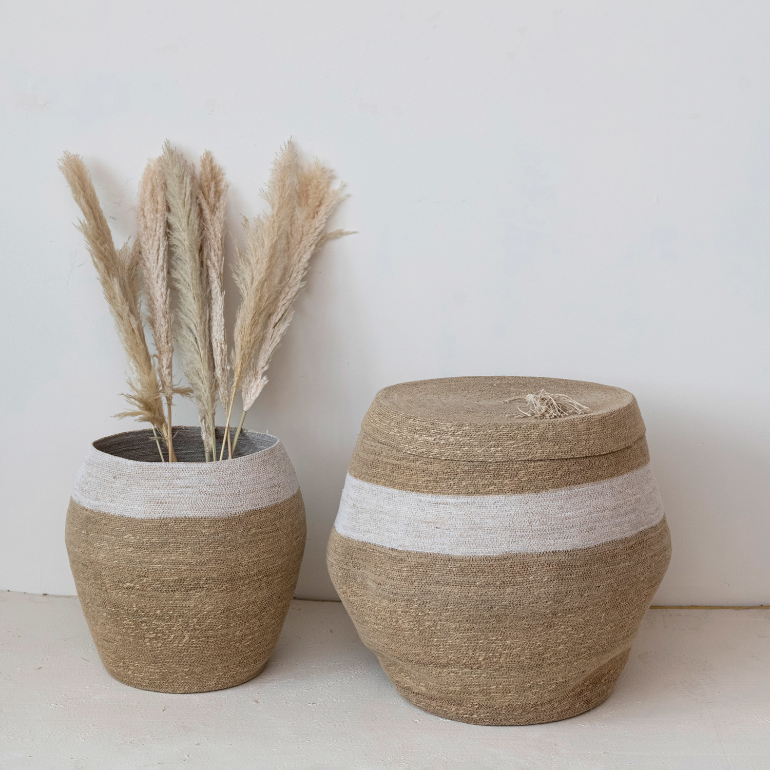 Catalog Name: 21-1/2" Round x 21-1/2"H & 15" Round x 17"H Woven Seagrass Baskets w/ (1) Lid & Tassel, Natural & White, Set of 2