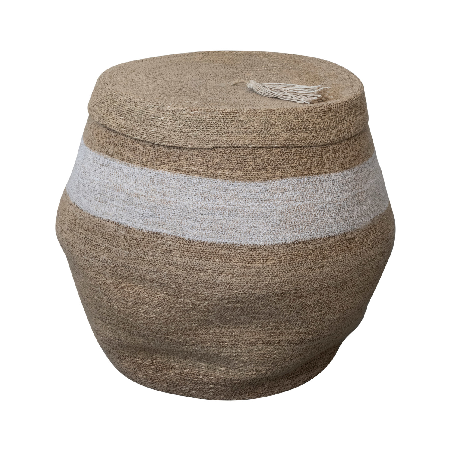 This set of 2 baskets is a unique and rustic storage solution. The round shape with a woven seagrass texture and lid adds a touch of elegance. The natural and white stripe and tassel design adds a touch of fun. Made from eco-friendly seagrass, these baskets are easy to clean and can be used to store blankets, pillows, toys, magazines, or other items. They complement any decor and style, adding charm and texture to any space. Whether placed in the living room, bedroom, hallway, or porch, these baskets bring a touch of farmhouse, boho, Scandinavian, French country, or coastal style to the home. This versatile and unique storage item seamlessly blends natural beauty with practicality.