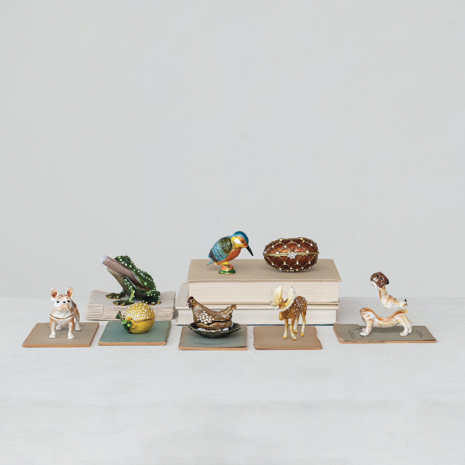 This Enameled Metal Hen On Nest Shaped Trinket Box is a quaint and colorful addition to any room. The gold-finished metal, complemented by an array of multi-colored jewels, captures the eye and the imagination. Measuring 2.75 inches long, 2.75 inches wide, and 1.5 inches high, it's the perfect size for holding small treasures. Its design is reminiscent of a pastoral idyll, making it a delightful piece for those who appreciate the beauty of the farmhouse or rustic aesthetics. Truck shipped to ensure it arrives in pristine condition, this trinket box is more than just storage; it's a miniature work of art that celebrates the charm of the countryside.