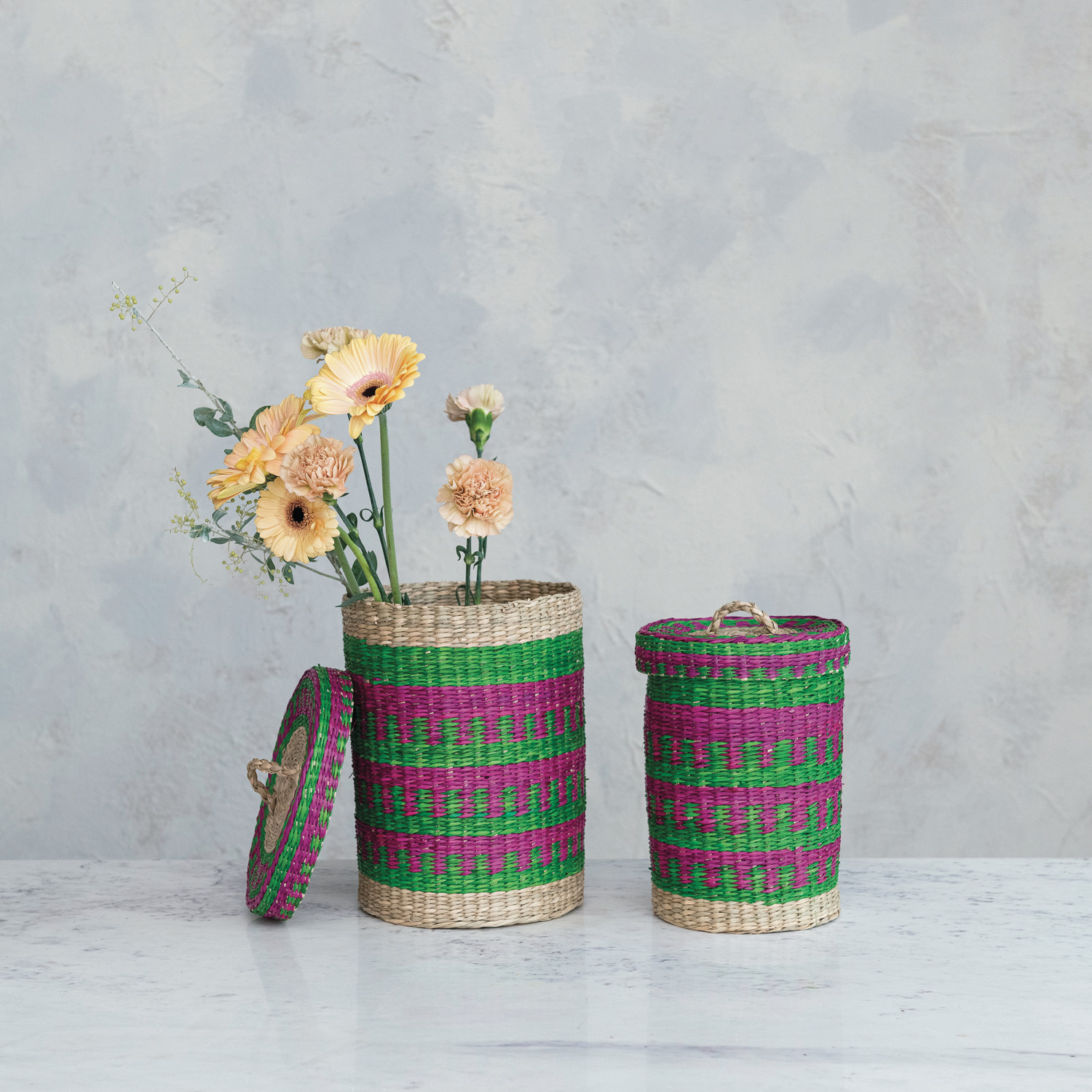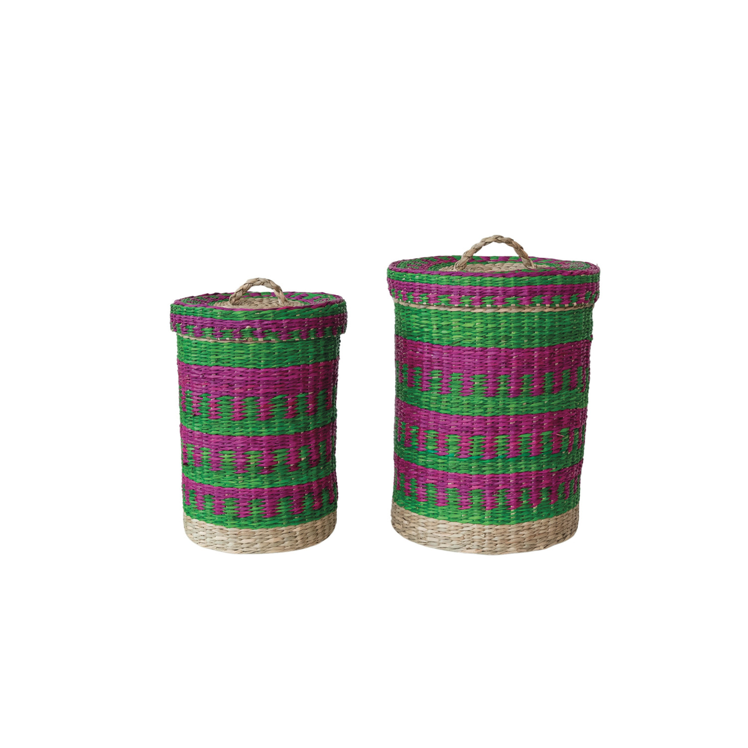 Catalog Name: 8-3/4" Round x 11"H & 7" Round x 9-3/4"H Hand-Woven Seagrass Baskets w/ Lids & Stripes, Green, Pink & Natural, Set of 2