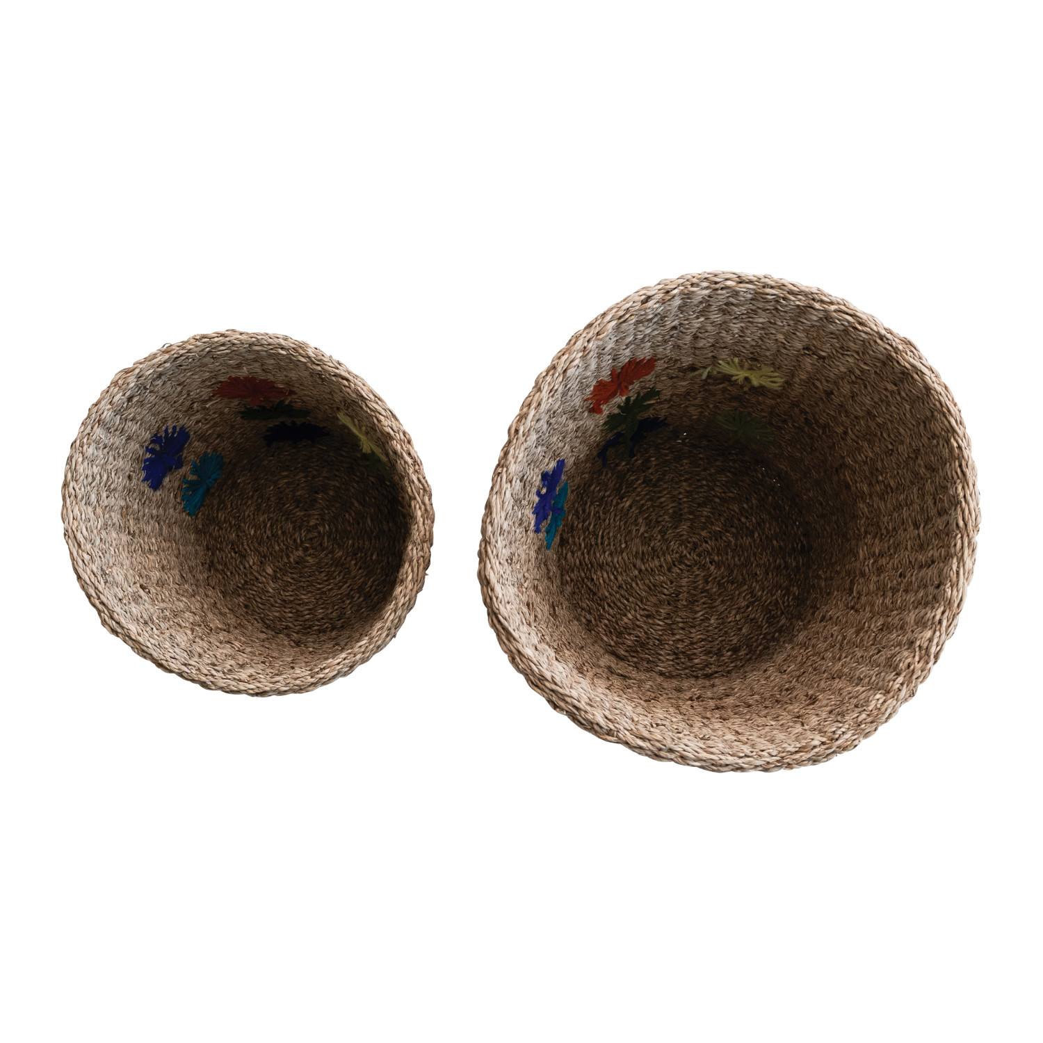 Catalog Name: 16" Round x 17-1/2"H & 12" Round x 15"H Hand-Woven Seagrass & Wool Baskets w/ Embroidered Flowers, Multi Color & Natural, Set of 2